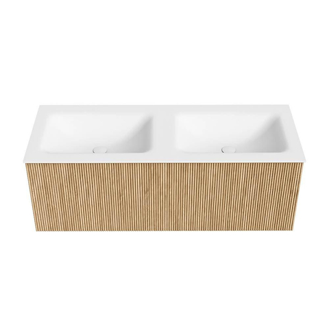 MONDIAZ KURVE 120cm badmeubel kleur Oak met 1 lade. Wastafel CLOUD dubbel zonder kraangat Talc.