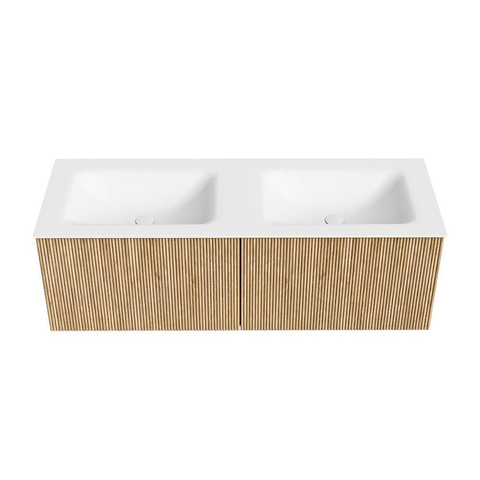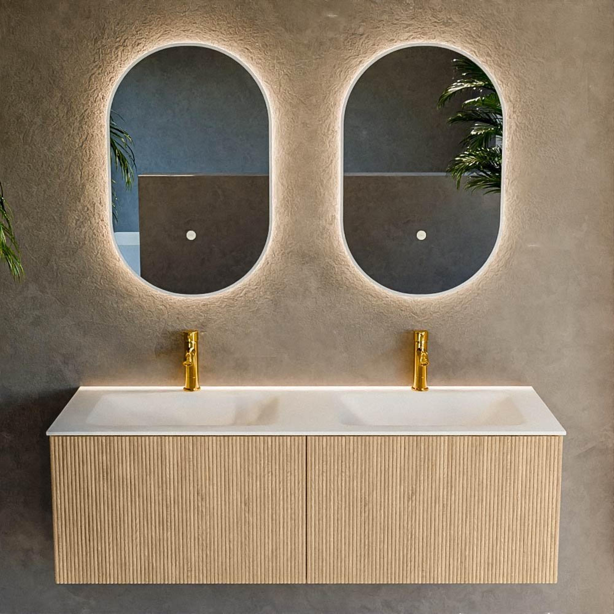 MONDIAZ KURVE 130cm badmeubel kleur Oak met 2 lades. Wastafel CLOUD dubbel 2 kraangaten Talc.