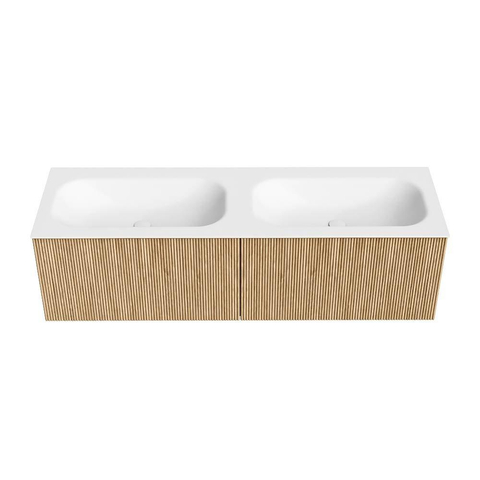 MONDIAZ KURVE 150cm badmeubel kleur Oak met 2 lades. Wastafel BIG SMALL dubbel zonder kraangat Talc.
