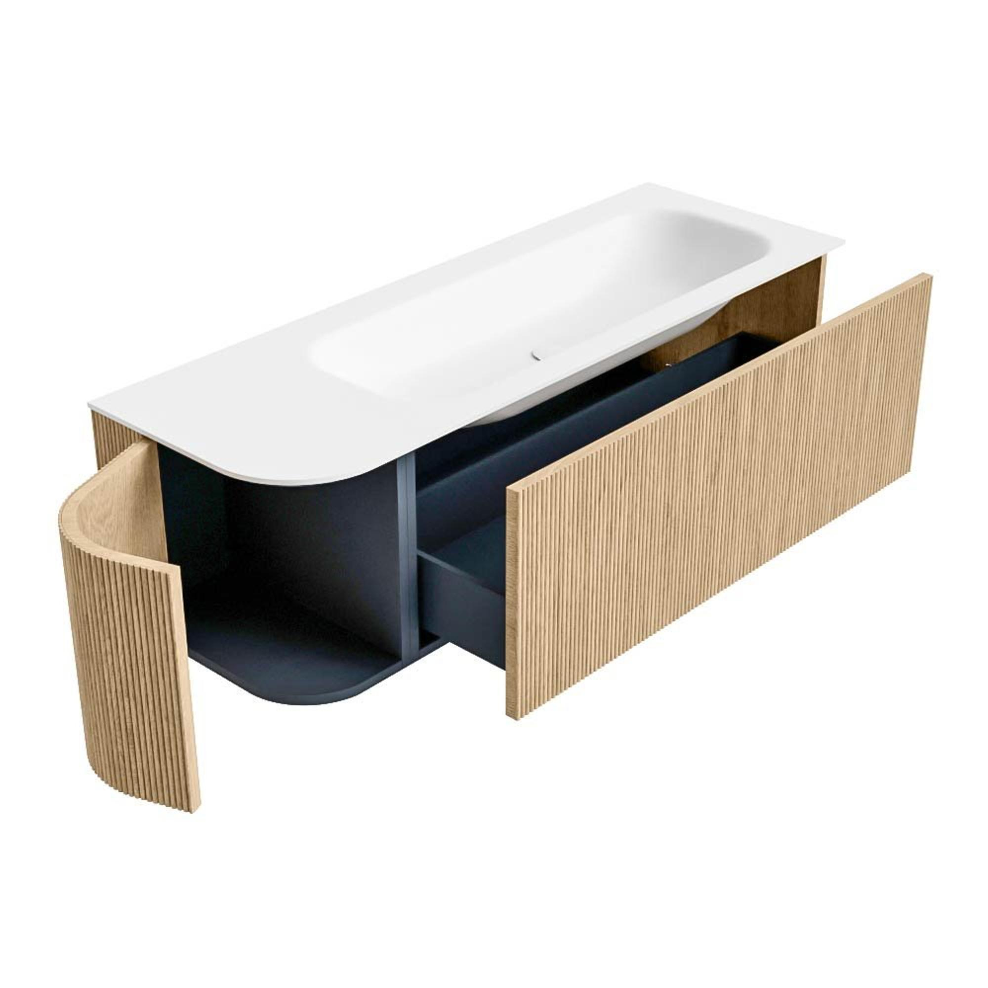 Het ultieme badmeubel dat je badkamer transformeert tot een oase van verfijning. Met zijn halfronde, verticale stroken van massief eiken, verkrijgbaar in de kleuren Oak en Walnut, straalt KURVE vakmanschap uit in elk detail. De zachte rondingen en slim ontworpen deurtjes, elk 40cm hoog, nodigen uit tot gebruik, terwijl de ruimte binnenin optimaal benut wordt dankzij de royale lade van dezelfde hoogte.