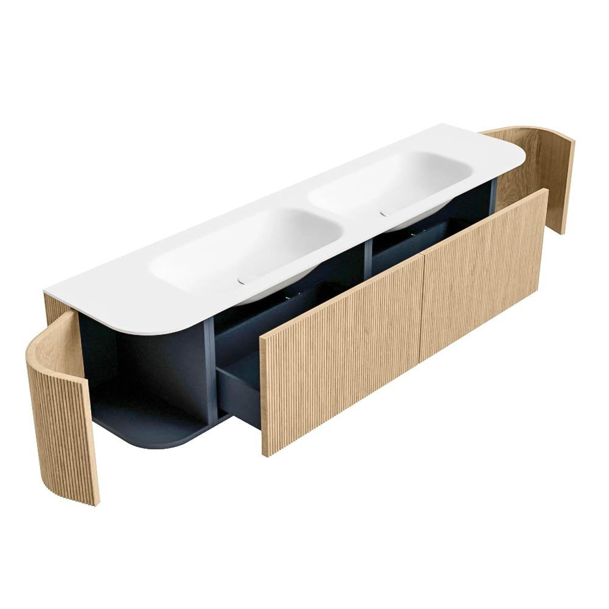 Het ultieme badmeubel dat je badkamer transformeert tot een oase van verfijning. Met zijn halfronde, verticale stroken van massief eiken, verkrijgbaar in de kleuren Oak en Walnut, straalt KURVE vakmanschap uit in elk detail. De zachte rondingen en slim ontworpen deurtjes, elk 40cm hoog, nodigen uit tot gebruik, terwijl de ruimte binnenin optimaal benut wordt dankzij de royale lade van dezelfde hoogte.