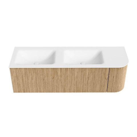 MONDIAZ KURVE 145cm badmeubel met module 25 R kleur Oak met 1 lade en 1 deur. Wastafel CLOUD dubbel / links zonder kraangat Talc.