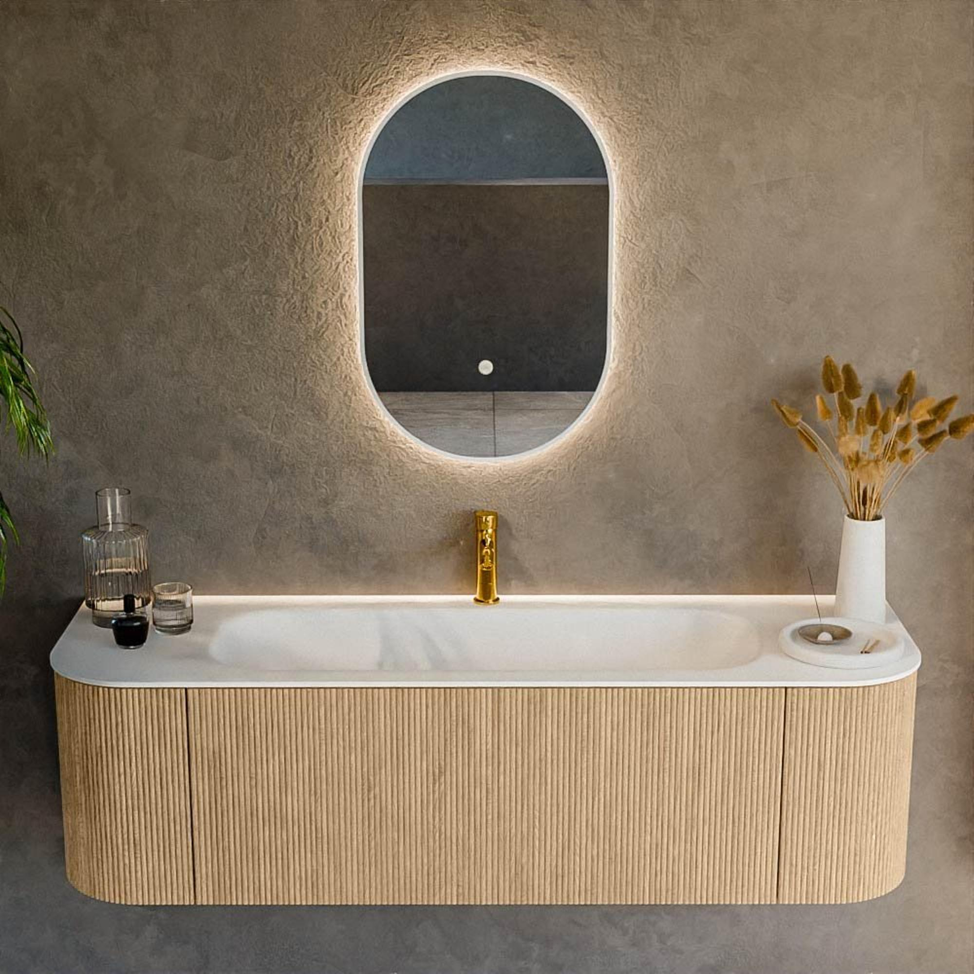 Personaliseer jouw KURVE met verschillende opties: Van een strak design zonder rondingen tot beide afgeronde hoeken, precies zoals jij het wilt. Beschikbaar in diverse maten, van 50cm tot 20cm, als set of op maat gemaakt voor jouw badkamer. Maak een statement met hoogwaardige wastafels in 5 CORIAN Solid Surface marmerkleuren en effen tinten zoals Talc en Urban. De set heeft ook meerdere modellen wastafels, elk met een unieke uitstraling en hoogwaardige afwerking, en laat KURVE jouw perfecte badkamer tot leven brengen.