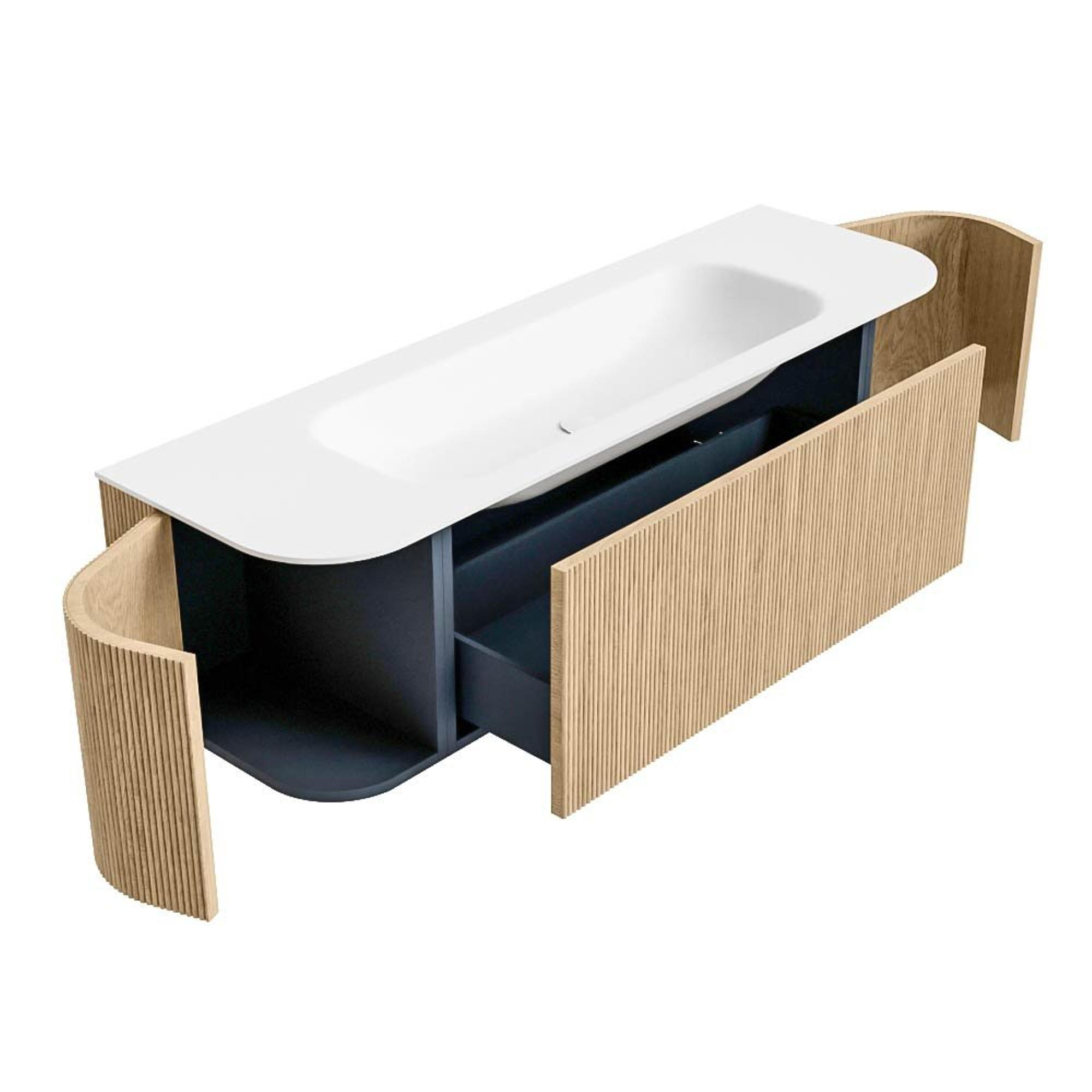 Het ultieme badmeubel dat je badkamer transformeert tot een oase van verfijning. Met zijn halfronde, verticale stroken van massief eiken, verkrijgbaar in de kleuren Oak en Walnut, straalt KURVE vakmanschap uit in elk detail. De zachte rondingen en slim ontworpen deurtjes, elk 40cm hoog, nodigen uit tot gebruik, terwijl de ruimte binnenin optimaal benut wordt dankzij de royale lade van dezelfde hoogte.