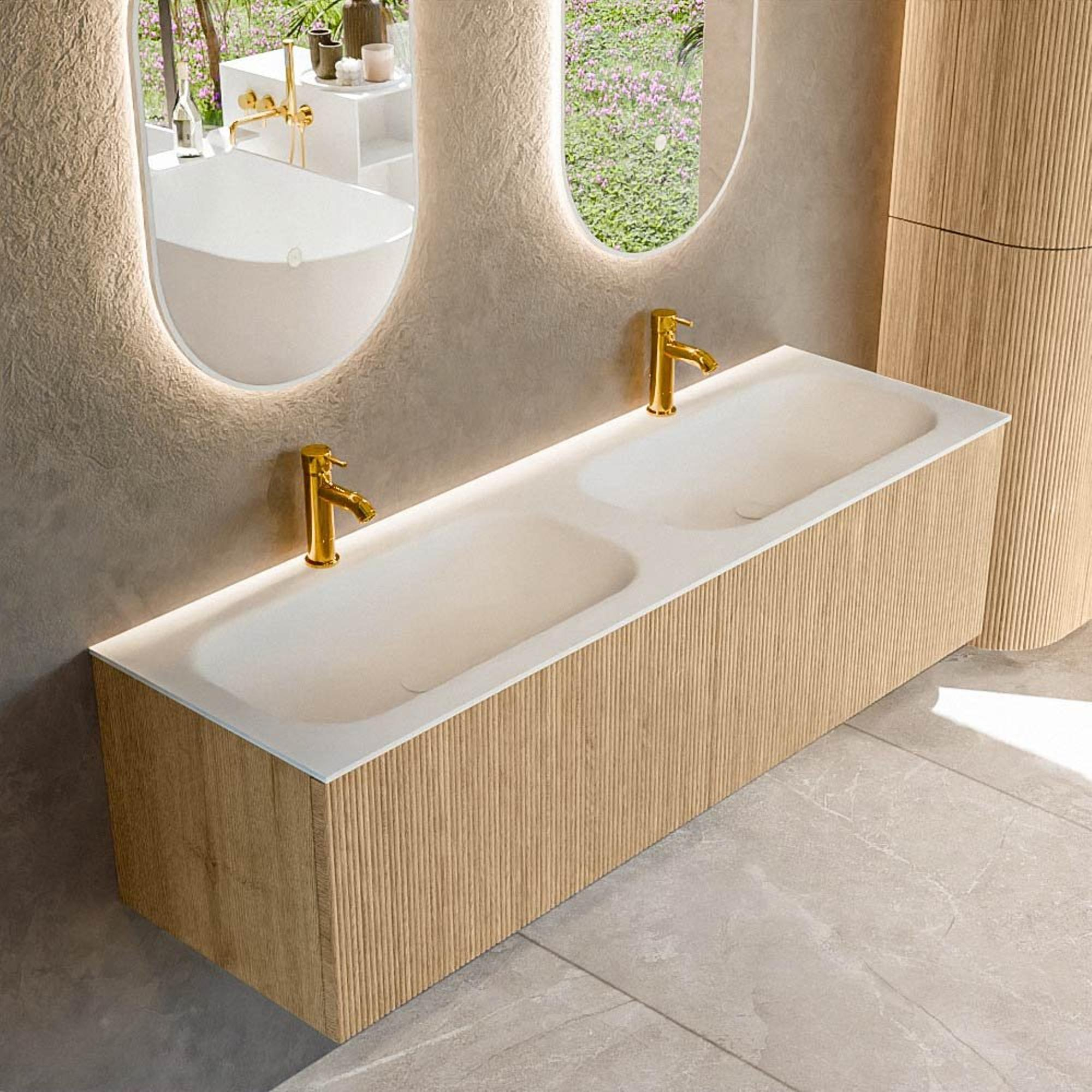 Het ultieme badmeubel dat je badkamer transformeert tot een oase van verfijning. Met zijn halfronde, verticale stroken van massief eiken, verkrijgbaar in de kleuren Oak en Walnut, straalt KURVE vakmanschap uit in elk detail. De zachte rondingen en slim ontworpen deurtjes, elk 40cm hoog, nodigen uit tot gebruik, terwijl de ruimte binnenin optimaal benut wordt dankzij de royale lade van dezelfde hoogte.