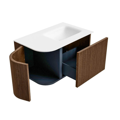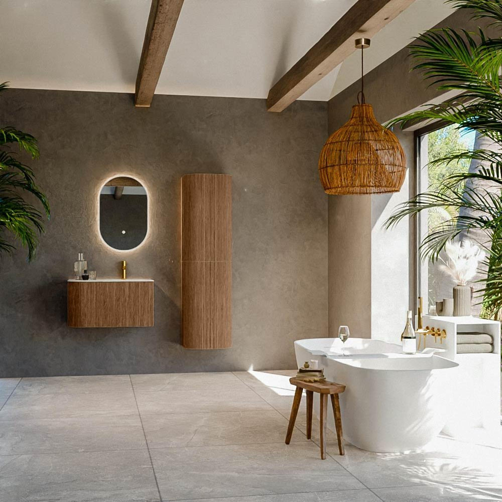 Het ultieme badmeubel dat je badkamer transformeert tot een oase van verfijning. Met zijn halfronde, verticale stroken van massief eiken, verkrijgbaar in de kleuren Oak en Walnut, straalt KURVE vakmanschap uit in elk detail. De zachte rondingen en slim ontworpen deurtjes, elk 40cm hoog, nodigen uit tot gebruik, terwijl de ruimte binnenin optimaal benut wordt dankzij de royale lade van dezelfde hoogte.