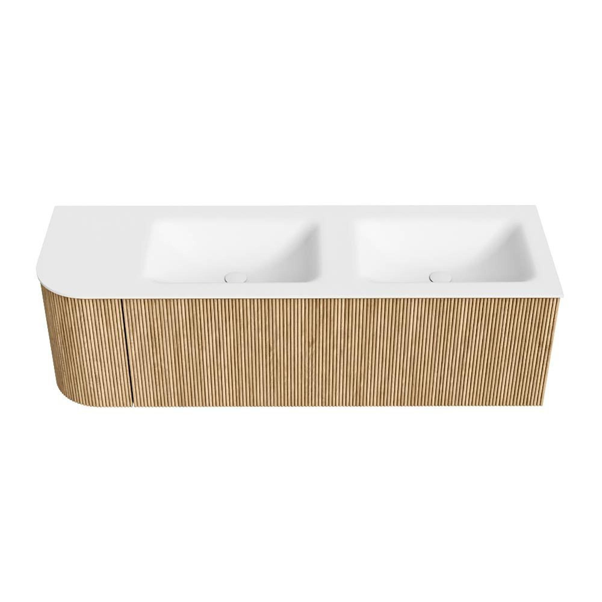MONDIAZ KURVE 145cm badmeubel met module 25 L kleur Oak met 1 lade en 1 deur. Wastafel CLOUD dubbel / rechts 2 kraangaten Talc.