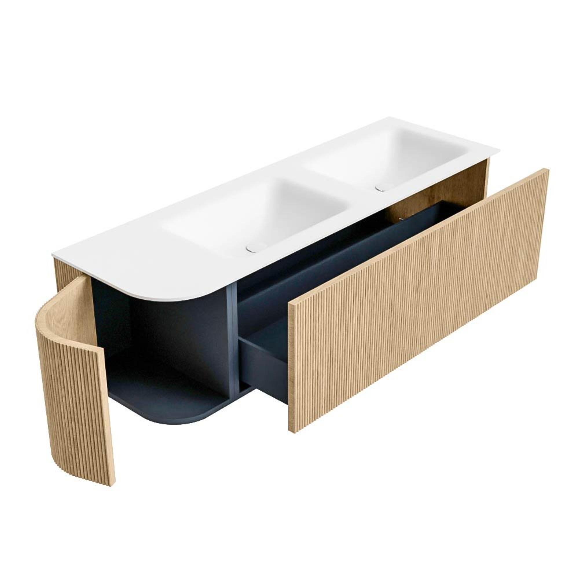 Het ultieme badmeubel dat je badkamer transformeert tot een oase van verfijning. Met zijn halfronde, verticale stroken van massief eiken, verkrijgbaar in de kleuren Oak en Walnut, straalt KURVE vakmanschap uit in elk detail. De zachte rondingen en slim ontworpen deurtjes, elk 40cm hoog, nodigen uit tot gebruik, terwijl de ruimte binnenin optimaal benut wordt dankzij de royale lade van dezelfde hoogte.