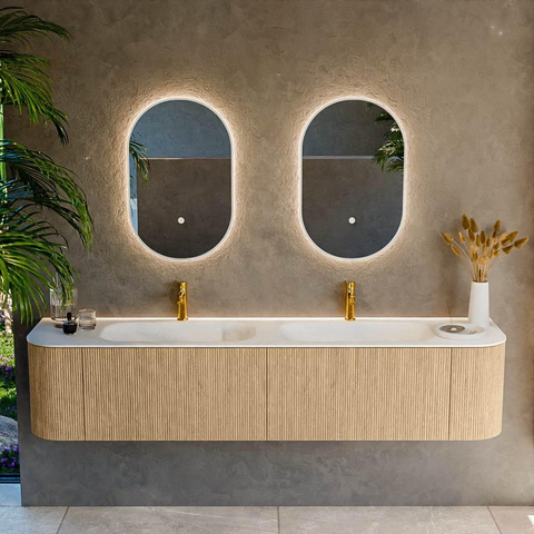 Het ultieme badmeubel dat je badkamer transformeert tot een oase van verfijning. Met zijn halfronde, verticale stroken van massief eiken, verkrijgbaar in de kleuren Oak en Walnut, straalt KURVE vakmanschap uit in elk detail. De zachte rondingen en slim ontworpen deurtjes, elk 40cm hoog, nodigen uit tot gebruik, terwijl de ruimte binnenin optimaal benut wordt dankzij de royale lade van dezelfde hoogte.