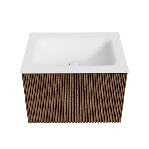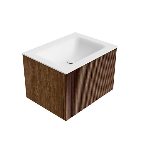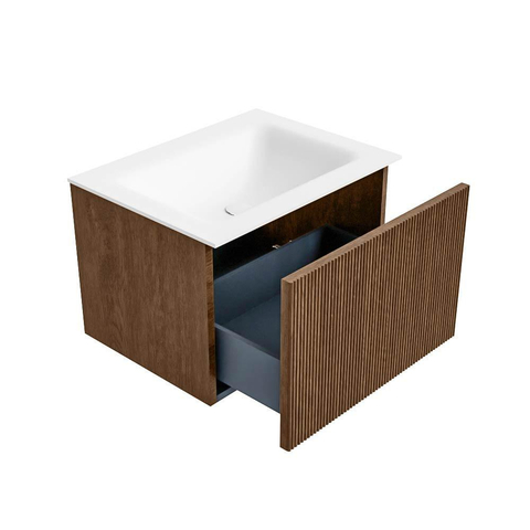 MONDIAZ KURVE 60cm badmeubel kleur Walnut met 1 lade. Wastafel CLOUD midden 1 kraangat Talc.