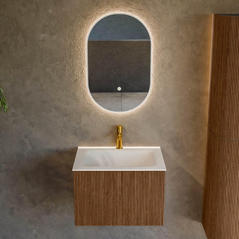 Het ultieme badmeubel dat je badkamer transformeert tot een oase van verfijning. Met zijn halfronde, verticale stroken van massief eiken, verkrijgbaar in de kleuren Oak en Walnut, straalt KURVE vakmanschap uit in elk detail. De zachte rondingen en slim ontworpen deurtjes, elk 40cm hoog, nodigen uit tot gebruik, terwijl de ruimte binnenin optimaal benut wordt dankzij de royale lade van dezelfde hoogte.