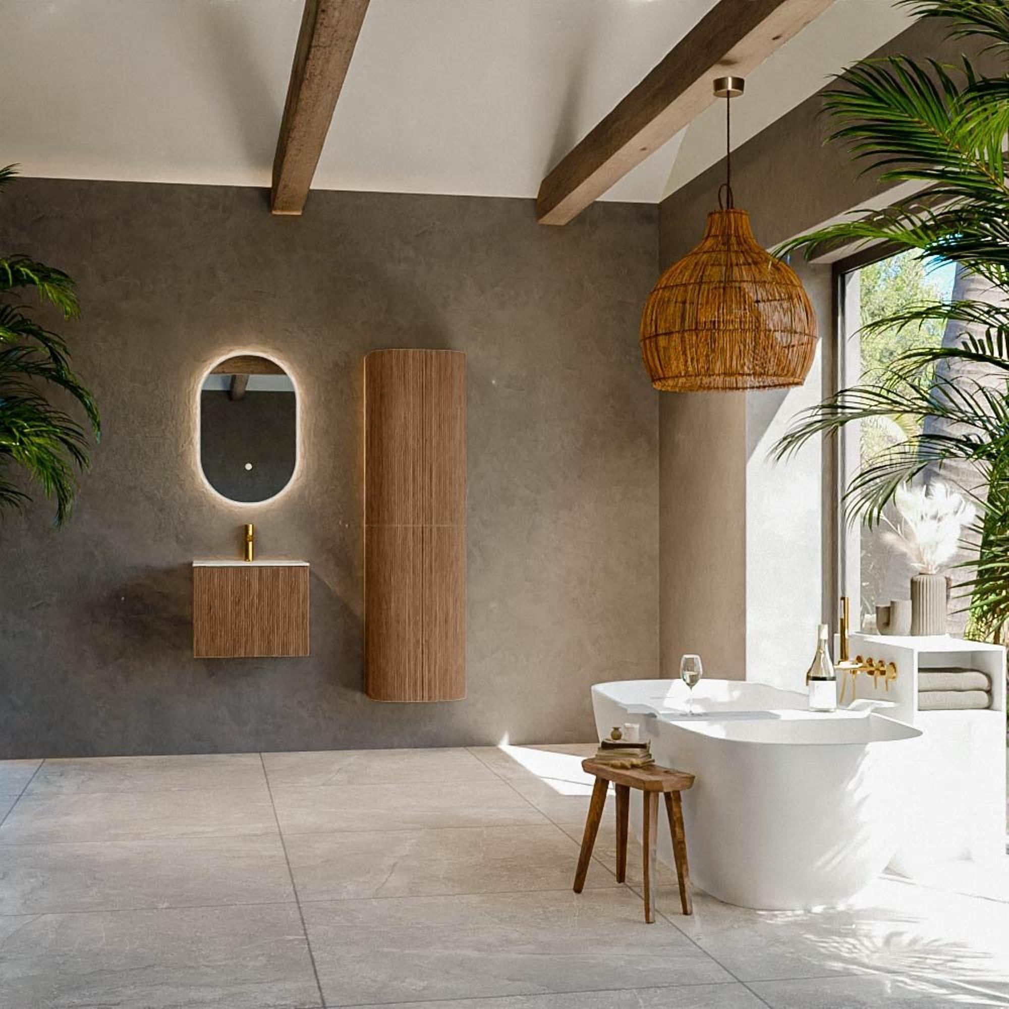 Het ultieme badmeubel dat je badkamer transformeert tot een oase van verfijning. Met zijn halfronde, verticale stroken van massief eiken, verkrijgbaar in de kleuren Oak en Walnut, straalt KURVE vakmanschap uit in elk detail. De zachte rondingen en slim ontworpen deurtjes, elk 40cm hoog, nodigen uit tot gebruik, terwijl de ruimte binnenin optimaal benut wordt dankzij de royale lade van dezelfde hoogte.