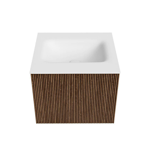 MONDIAZ KURVE 50cm badmeubel kleur Walnut met 1 lade. Wastafel GRUNNE midden 1 kraangat Talc.