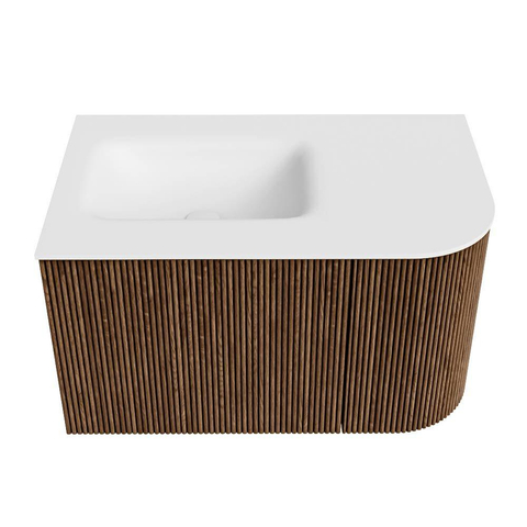 MONDIAZ KURVE 75cm badmeubel met module 25 R kleur Walnut met 1 lade en 1 deur. Wastafel GRUNNE links 1 kraangat Talc.
