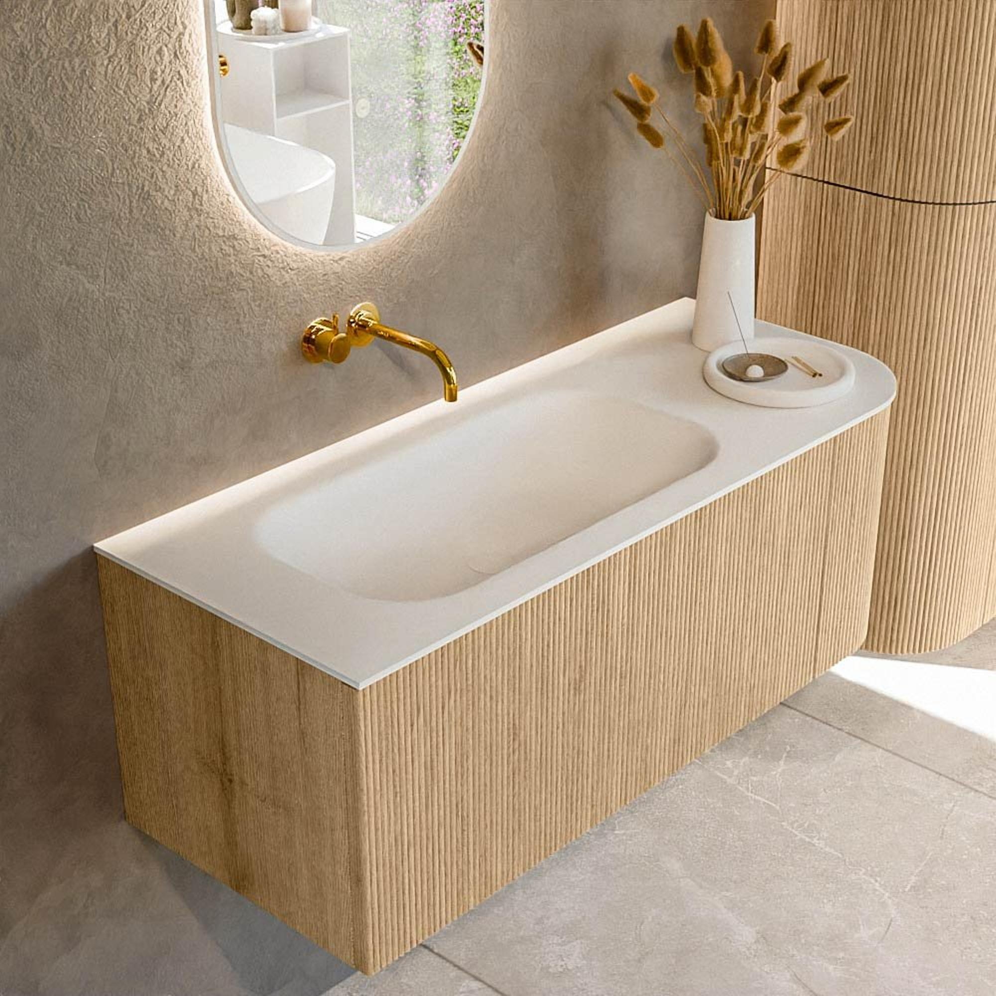 Het ultieme badmeubel dat je badkamer transformeert tot een oase van verfijning. Met zijn halfronde, verticale stroken van massief eiken, verkrijgbaar in de kleuren Oak en Walnut, straalt KURVE vakmanschap uit in elk detail. De zachte rondingen en slim ontworpen deurtjes, elk 40cm hoog, nodigen uit tot gebruik, terwijl de ruimte binnenin optimaal benut wordt dankzij de royale lade van dezelfde hoogte.