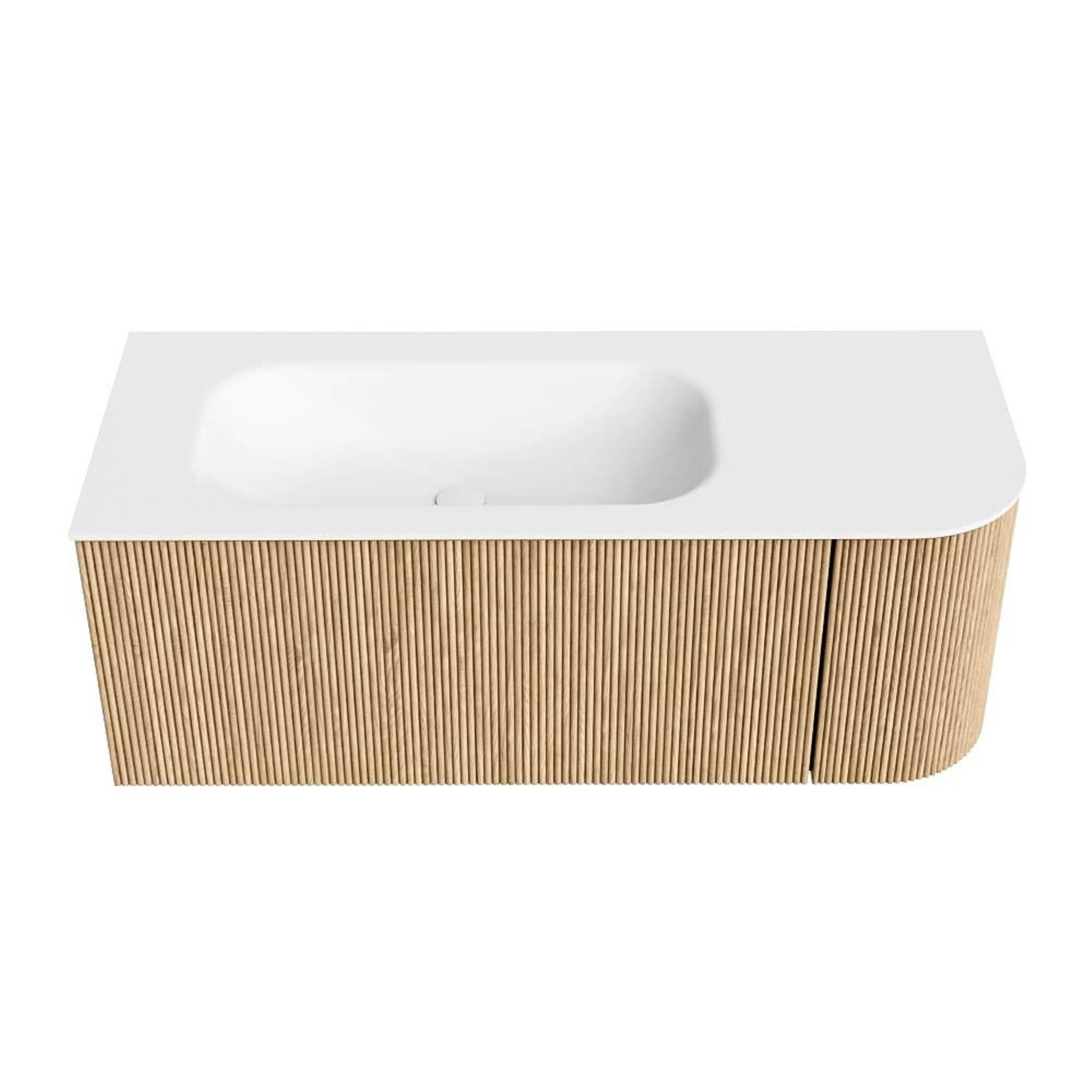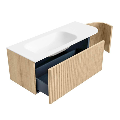MONDIAZ KURVE 115cm badmeubel met module 25 R kleur Oak met 1 lade en 1 deur. Wastafel BIG SMALL links zonder kraangat Talc.
