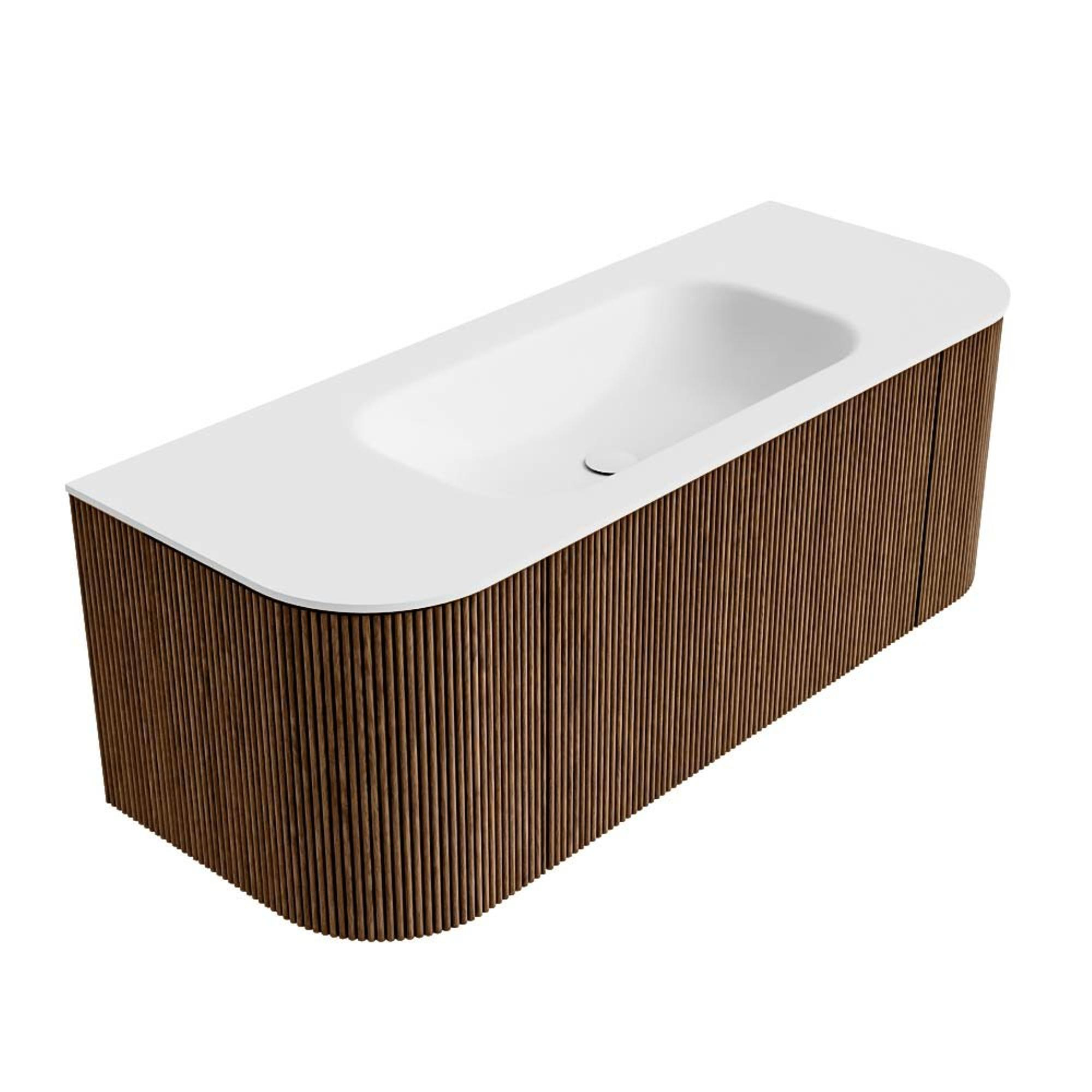 Het ultieme badmeubel dat je badkamer transformeert tot een oase van verfijning. Met zijn halfronde, verticale stroken van massief eiken, verkrijgbaar in de kleuren Oak en Walnut, straalt KURVE vakmanschap uit in elk detail. De zachte rondingen en slim ontworpen deurtjes, elk 40cm hoog, nodigen uit tot gebruik, terwijl de ruimte binnenin optimaal benut wordt dankzij de royale lade van dezelfde hoogte.