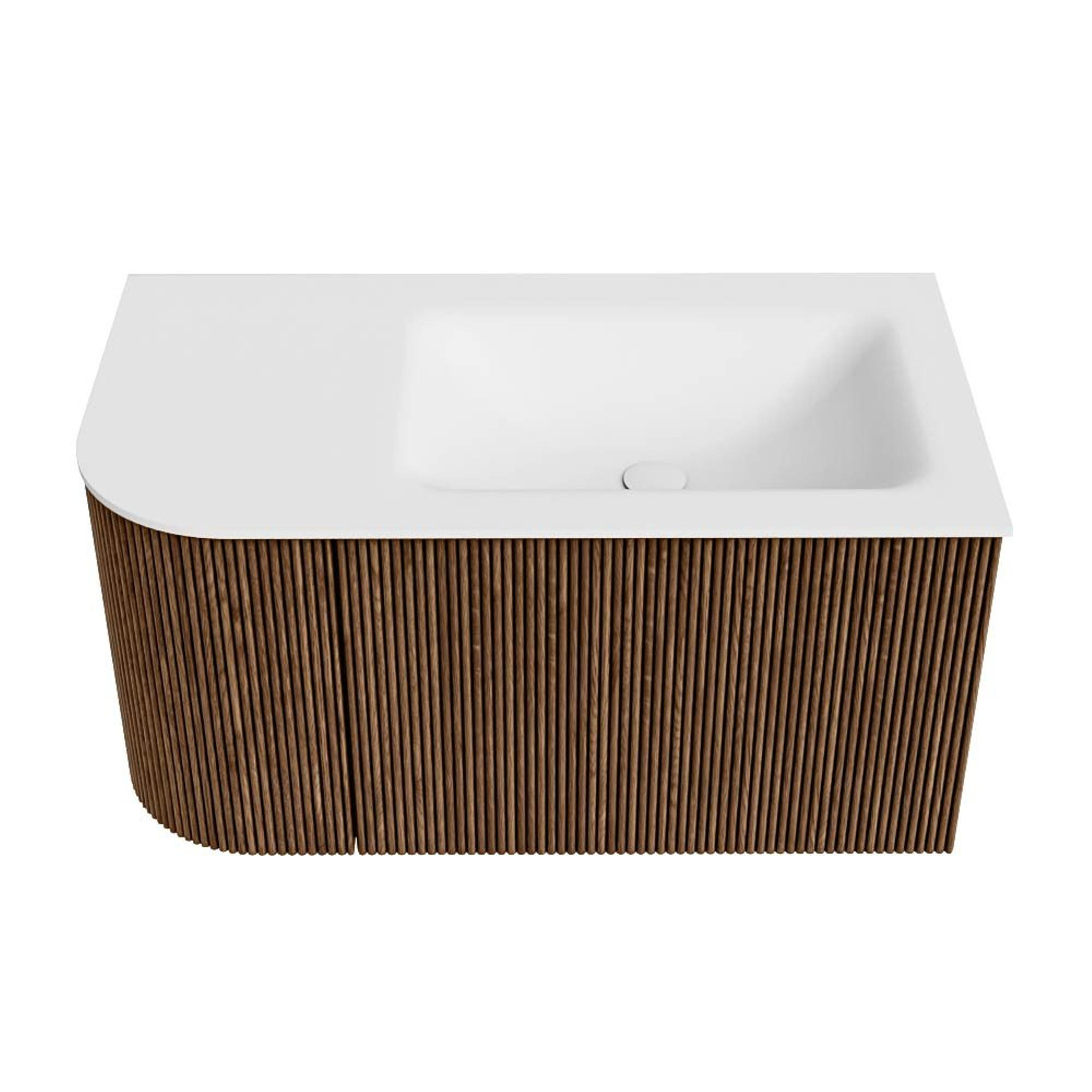 MONDIAZ KURVE 85cm badmeubel met module 25 L kleur Walnut met 1 lade en 1 deur. Wastafel CLOUD rechts zonder kraangat Talc.