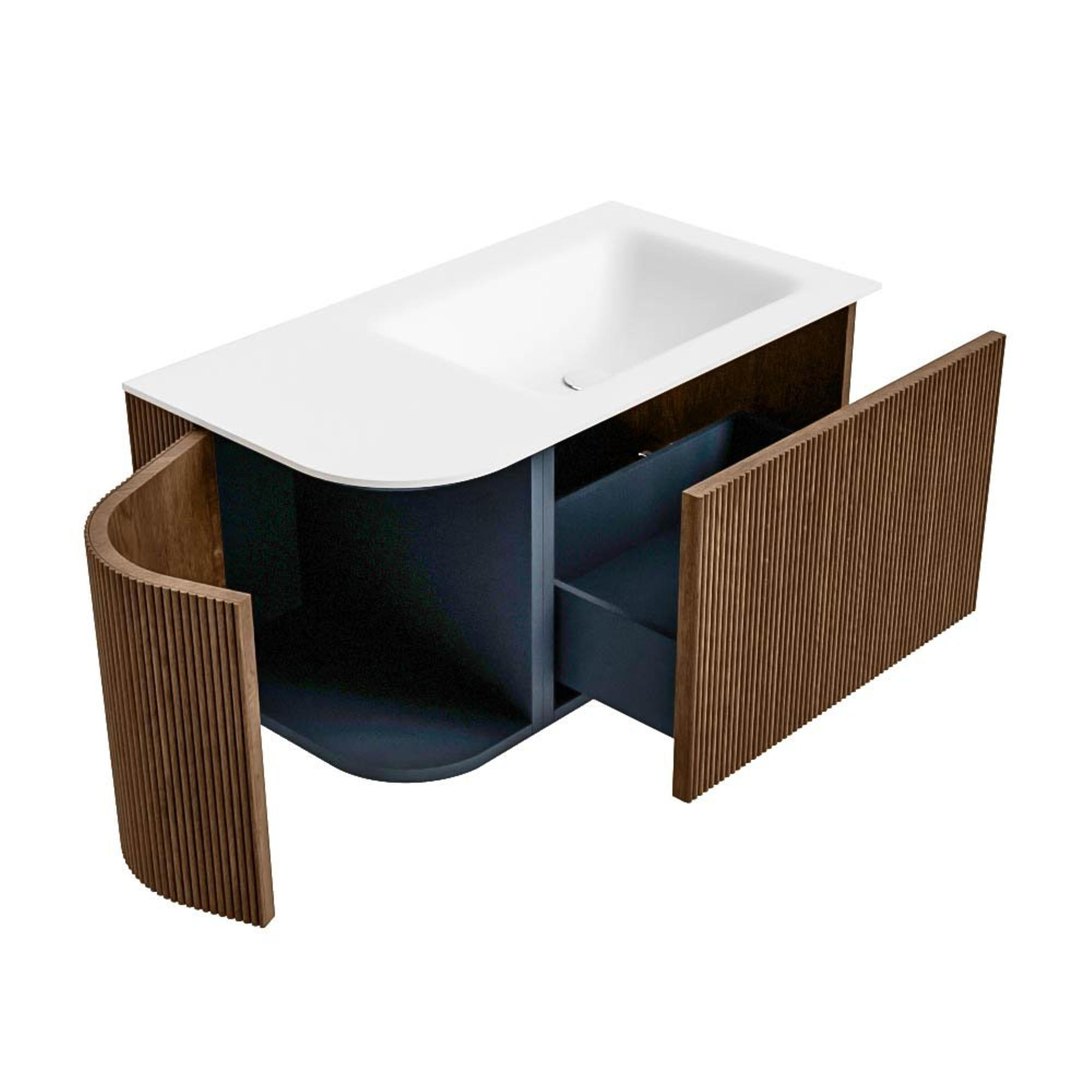 Het ultieme badmeubel dat je badkamer transformeert tot een oase van verfijning. Met zijn halfronde, verticale stroken van massief eiken, verkrijgbaar in de kleuren Oak en Walnut, straalt KURVE vakmanschap uit in elk detail. De zachte rondingen en slim ontworpen deurtjes, elk 40cm hoog, nodigen uit tot gebruik, terwijl de ruimte binnenin optimaal benut wordt dankzij de royale lade van dezelfde hoogte.