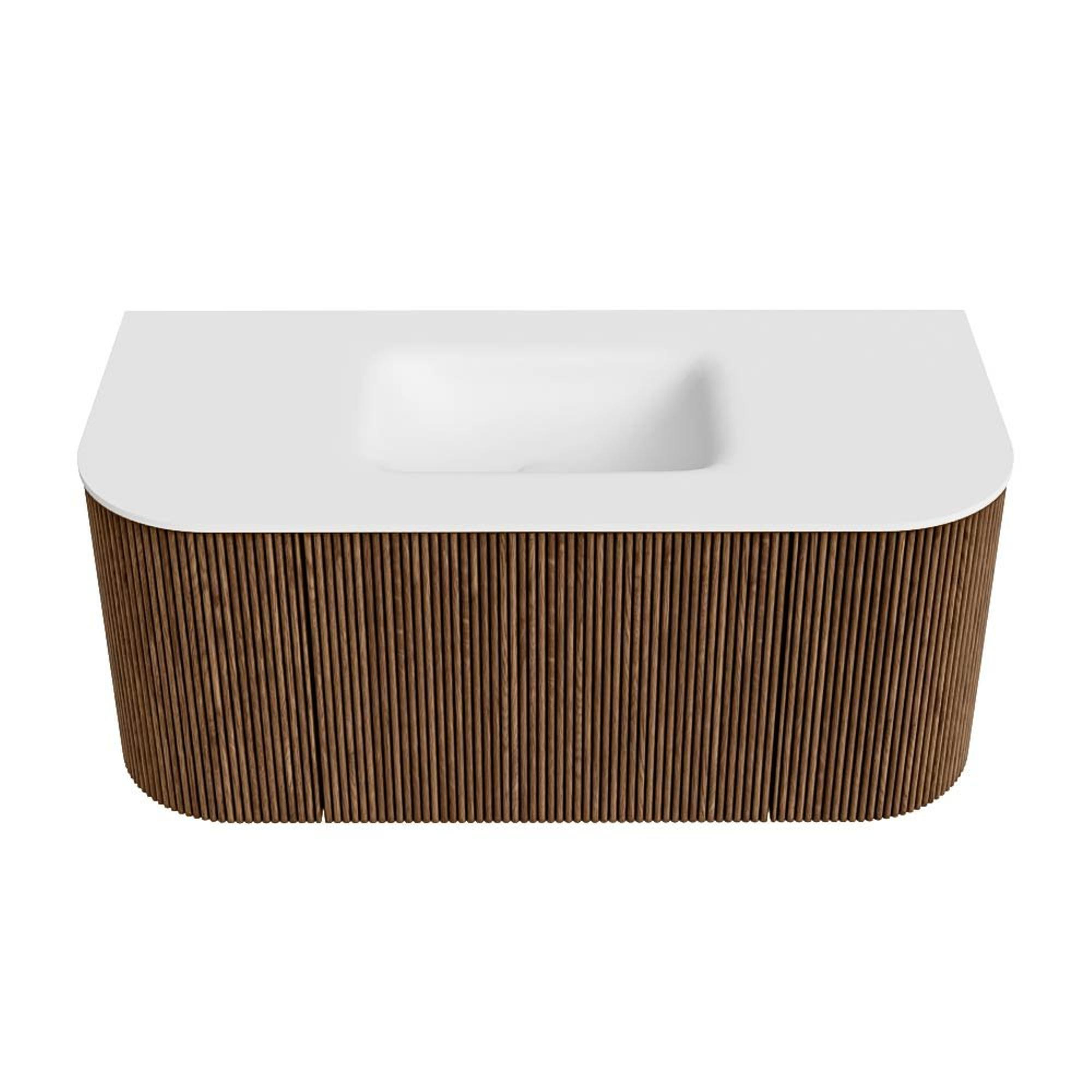 MONDIAZ KURVE 100cm badmeubel met module 25 Len R kleur Walnut met 1 lade en 2 deuren. Wastafel GRUNNE midden 1 kraangat Talc.