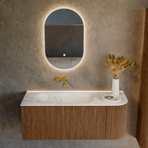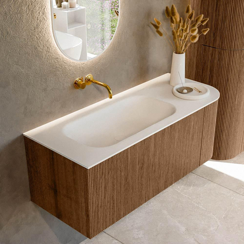 Het ultieme badmeubel dat je badkamer transformeert tot een oase van verfijning. Met zijn halfronde, verticale stroken van massief eiken, verkrijgbaar in de kleuren Oak en Walnut, straalt KURVE vakmanschap uit in elk detail. De zachte rondingen en slim ontworpen deurtjes, elk 40cm hoog, nodigen uit tot gebruik, terwijl de ruimte binnenin optimaal benut wordt dankzij de royale lade van dezelfde hoogte.