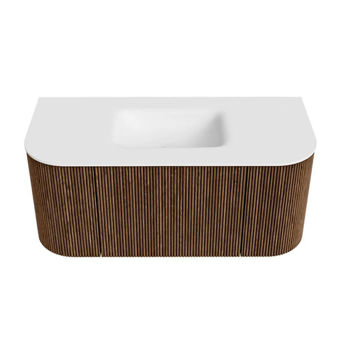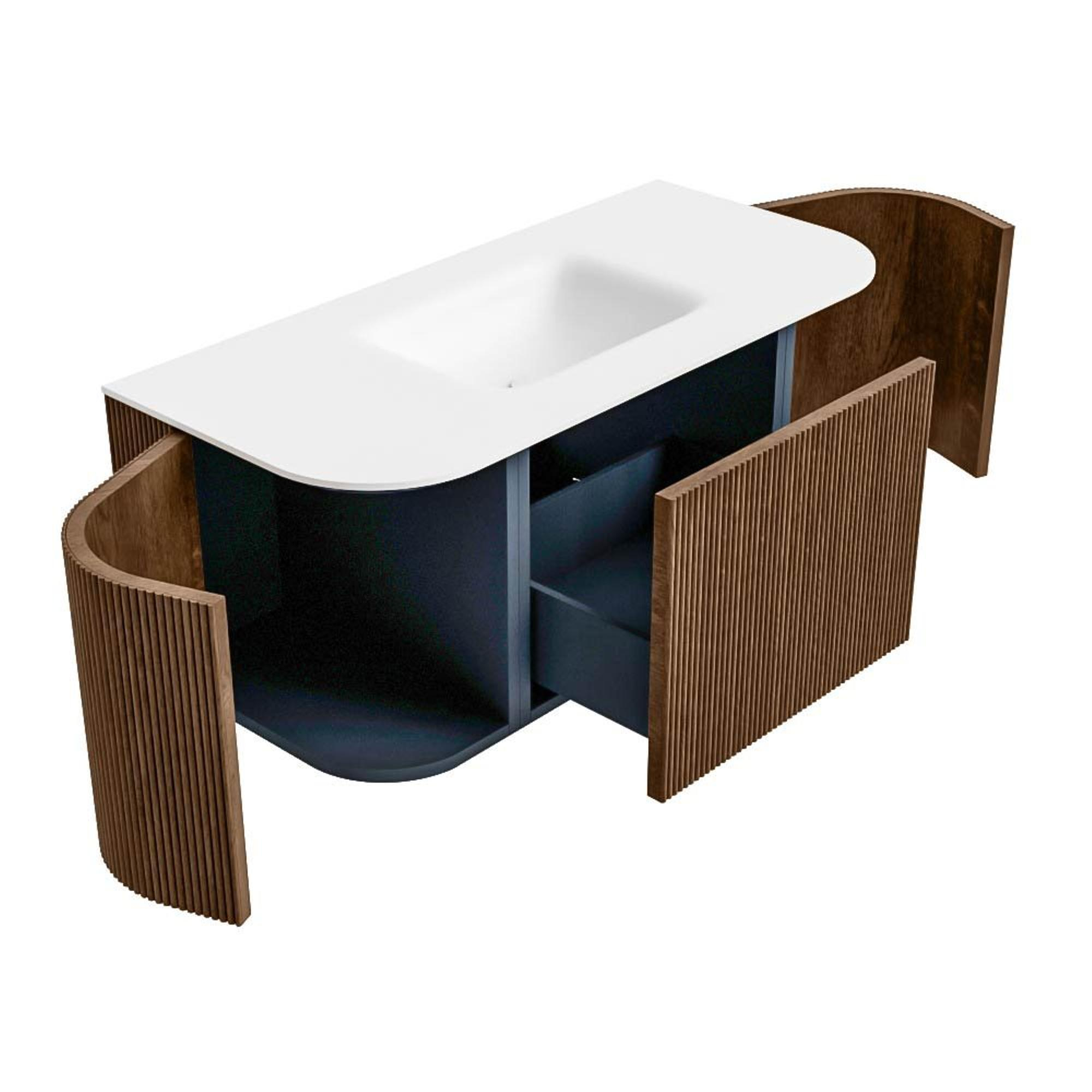 Het ultieme badmeubel dat je badkamer transformeert tot een oase van verfijning. Met zijn halfronde, verticale stroken van massief eiken, verkrijgbaar in de kleuren Oak en Walnut, straalt KURVE vakmanschap uit in elk detail. De zachte rondingen en slim ontworpen deurtjes, elk 40cm hoog, nodigen uit tot gebruik, terwijl de ruimte binnenin optimaal benut wordt dankzij de royale lade van dezelfde hoogte.