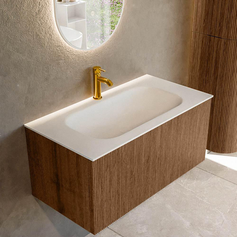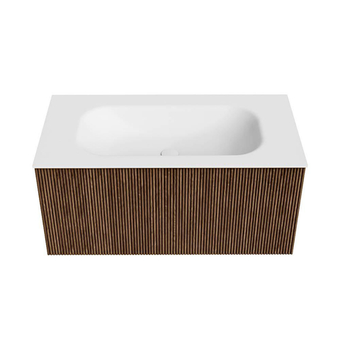 MONDIAZ KURVE 90cm badmeubel kleur Walnut met 1 lade. Wastafel BIG SMALL midden 1 kraangat Talc.