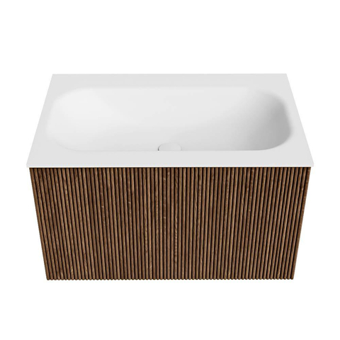 MONDIAZ KURVE 70cm badmeubel kleur Walnut met 1 lade. Wastafel BIG SMALL midden zonder kraangat Talc.