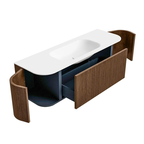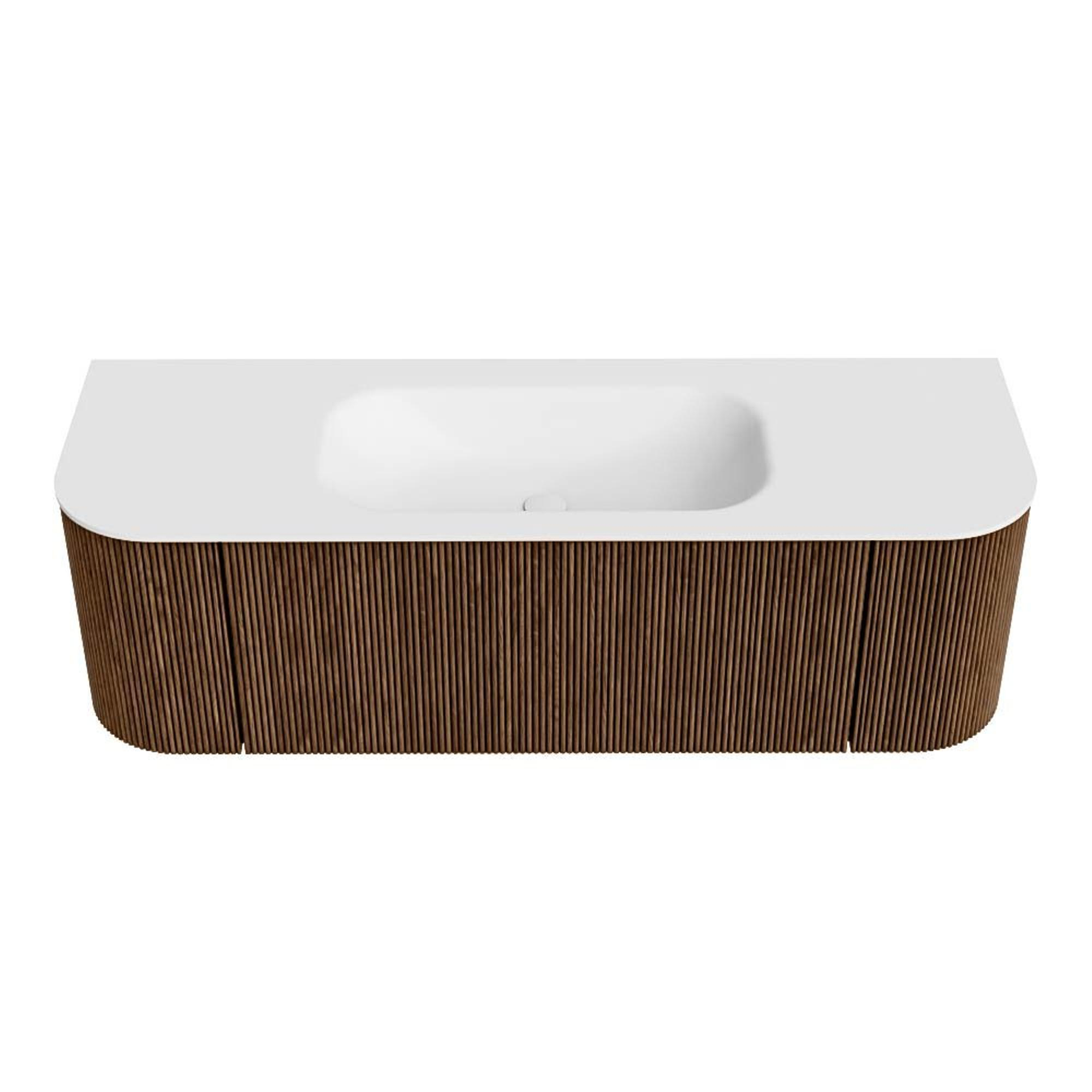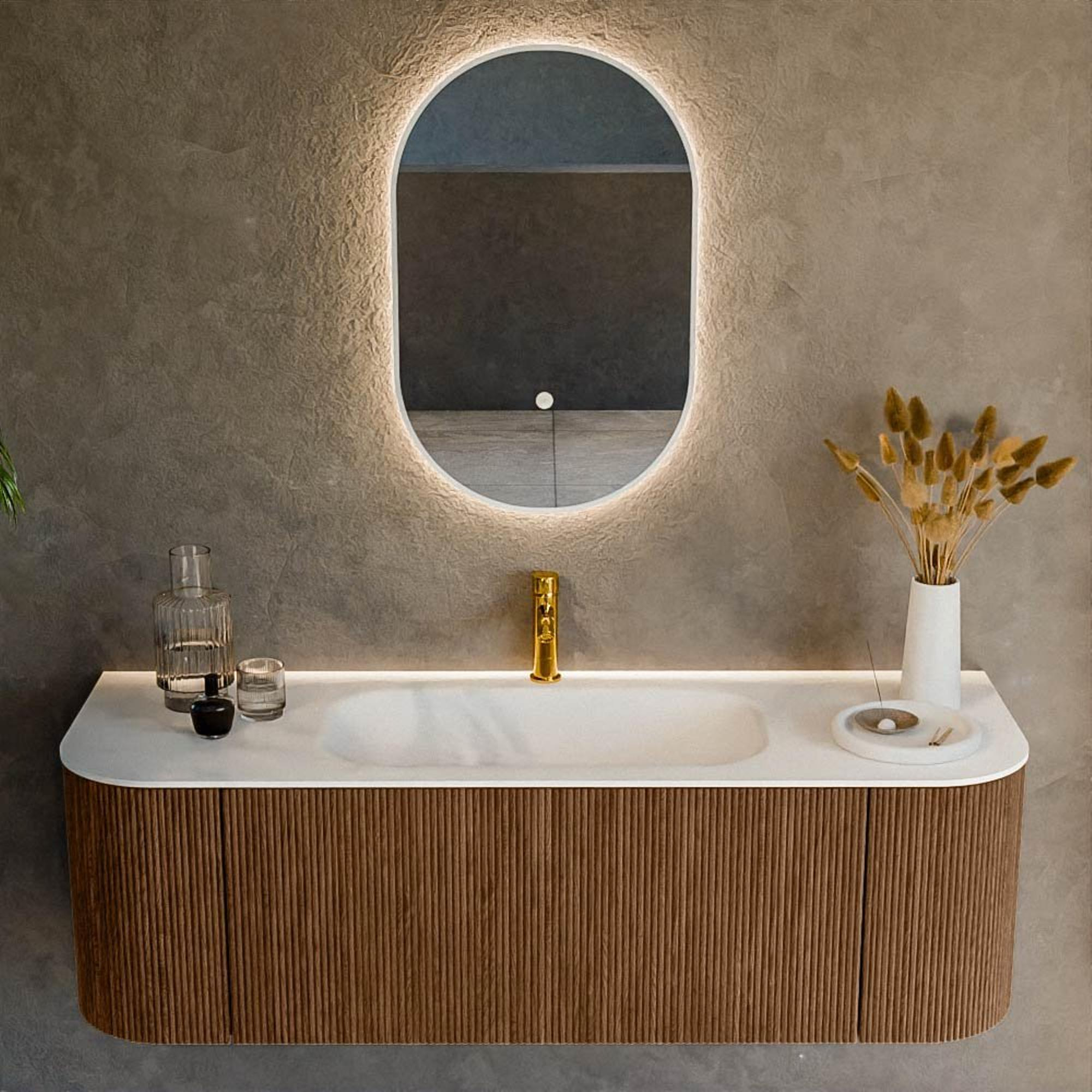 Het ultieme badmeubel dat je badkamer transformeert tot een oase van verfijning. Met zijn halfronde, verticale stroken van massief eiken, verkrijgbaar in de kleuren Oak en Walnut, straalt KURVE vakmanschap uit in elk detail. De zachte rondingen en slim ontworpen deurtjes, elk 40cm hoog, nodigen uit tot gebruik, terwijl de ruimte binnenin optimaal benut wordt dankzij de royale lade van dezelfde hoogte.