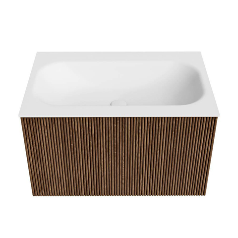 MONDIAZ KURVE 70cm badmeubel kleur Walnut met 1 lade. Wastafel BIG SMALL midden 1 kraangat Talc.