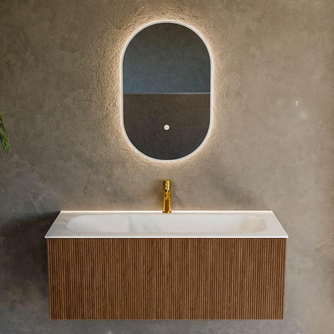 Het ultieme badmeubel dat je badkamer transformeert tot een oase van verfijning. Met zijn halfronde, verticale stroken van massief eiken, verkrijgbaar in de kleuren Oak en Walnut, straalt KURVE vakmanschap uit in elk detail. De zachte rondingen en slim ontworpen deurtjes, elk 40cm hoog, nodigen uit tot gebruik, terwijl de ruimte binnenin optimaal benut wordt dankzij de royale lade van dezelfde hoogte.