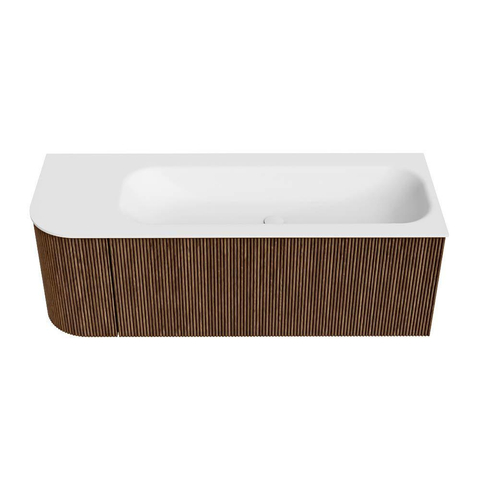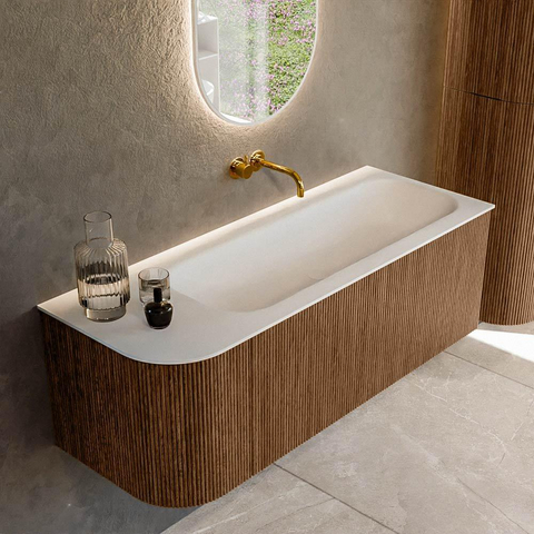 Het ultieme badmeubel dat je badkamer transformeert tot een oase van verfijning. Met zijn halfronde, verticale stroken van massief eiken, verkrijgbaar in de kleuren Oak en Walnut, straalt KURVE vakmanschap uit in elk detail. De zachte rondingen en slim ontworpen deurtjes, elk 40cm hoog, nodigen uit tot gebruik, terwijl de ruimte binnenin optimaal benut wordt dankzij de royale lade van dezelfde hoogte.