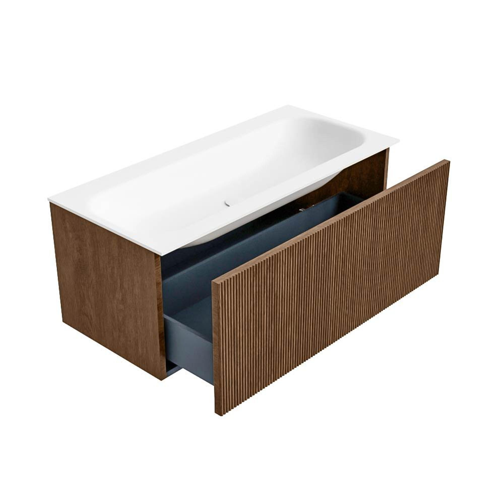 Het ultieme badmeubel dat je badkamer transformeert tot een oase van verfijning. Met zijn halfronde, verticale stroken van massief eiken, verkrijgbaar in de kleuren Oak en Walnut, straalt KURVE vakmanschap uit in elk detail. De zachte rondingen en slim ontworpen deurtjes, elk 40cm hoog, nodigen uit tot gebruik, terwijl de ruimte binnenin optimaal benut wordt dankzij de royale lade van dezelfde hoogte.