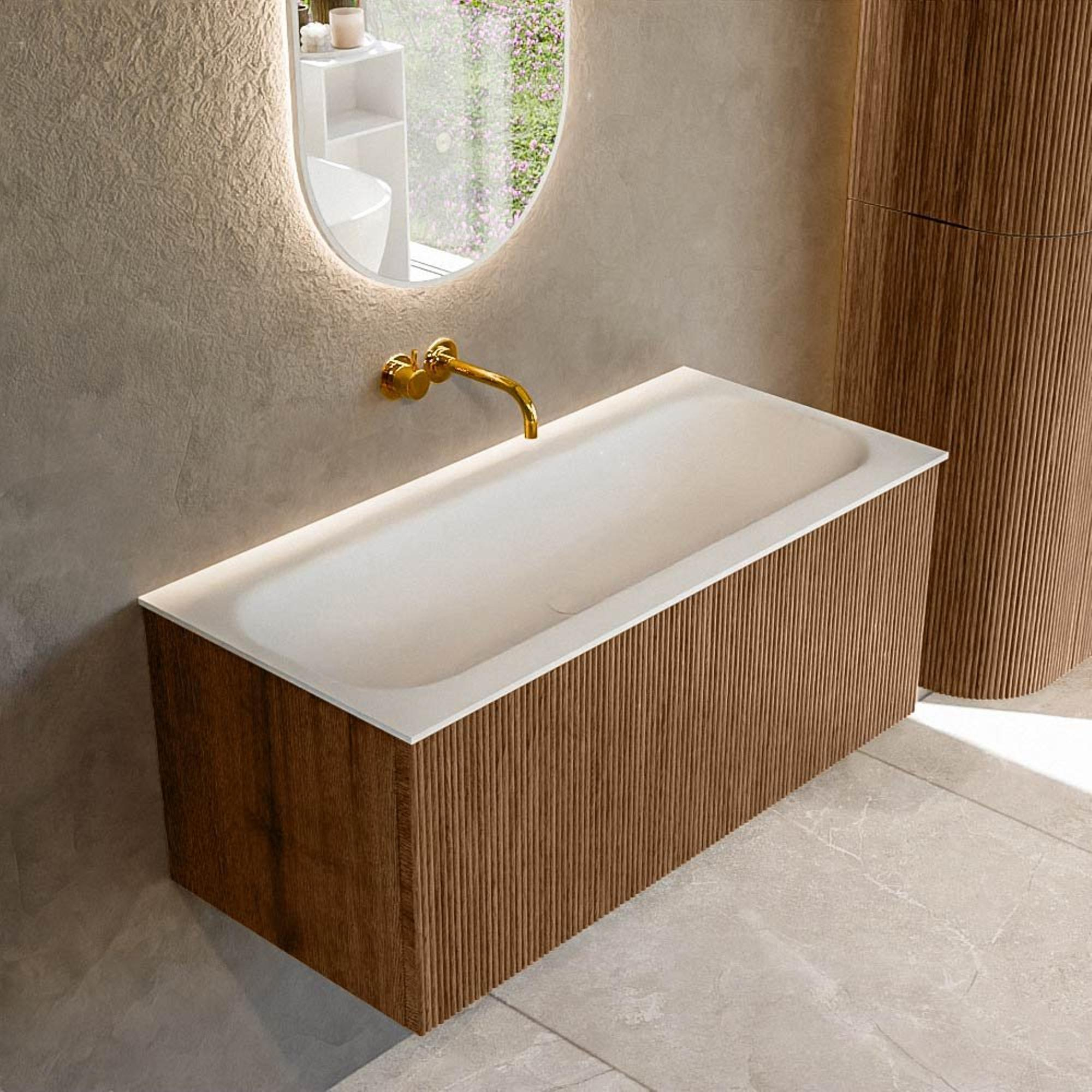 MONDIAZ KURVE 100cm badmeubel kleur Walnut met 1 lade. Wastafel BIG MEDIUM midden zonder kraangat Talc.