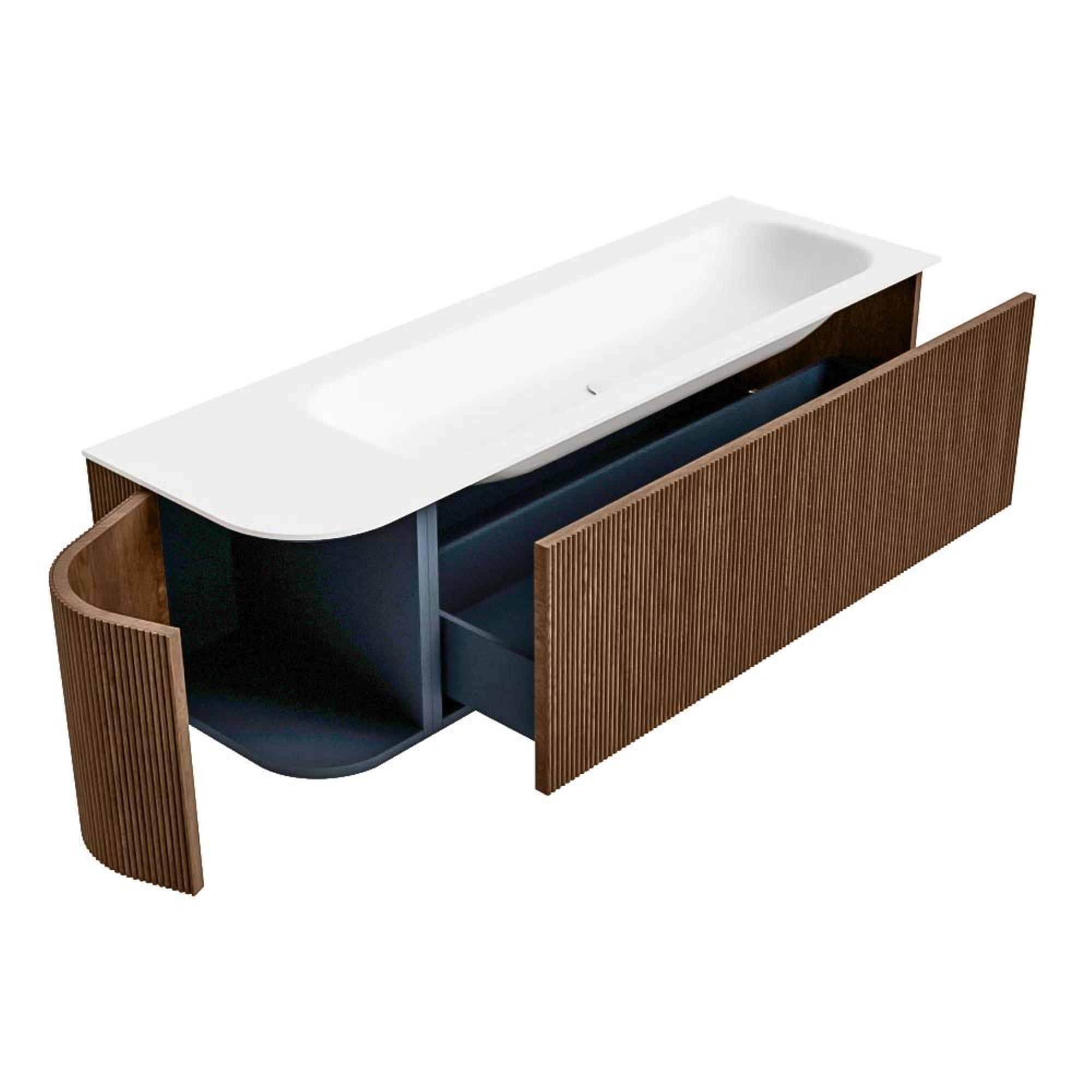 Het ultieme badmeubel dat je badkamer transformeert tot een oase van verfijning. Met zijn halfronde, verticale stroken van massief eiken, verkrijgbaar in de kleuren Oak en Walnut, straalt KURVE vakmanschap uit in elk detail. De zachte rondingen en slim ontworpen deurtjes, elk 40cm hoog, nodigen uit tot gebruik, terwijl de ruimte binnenin optimaal benut wordt dankzij de royale lade van dezelfde hoogte.