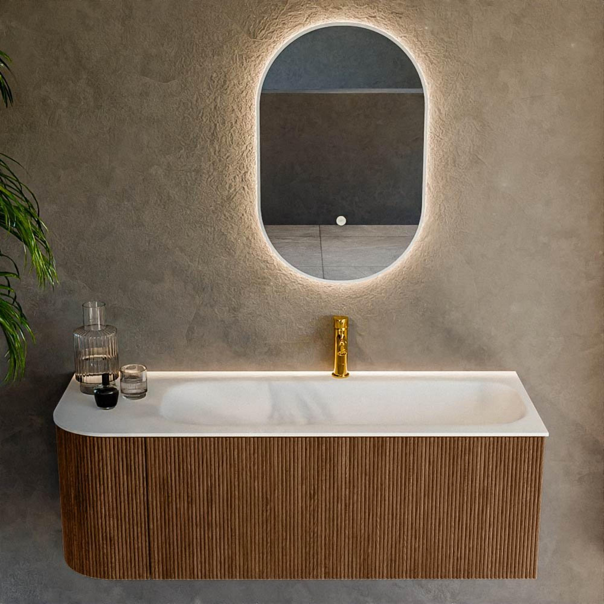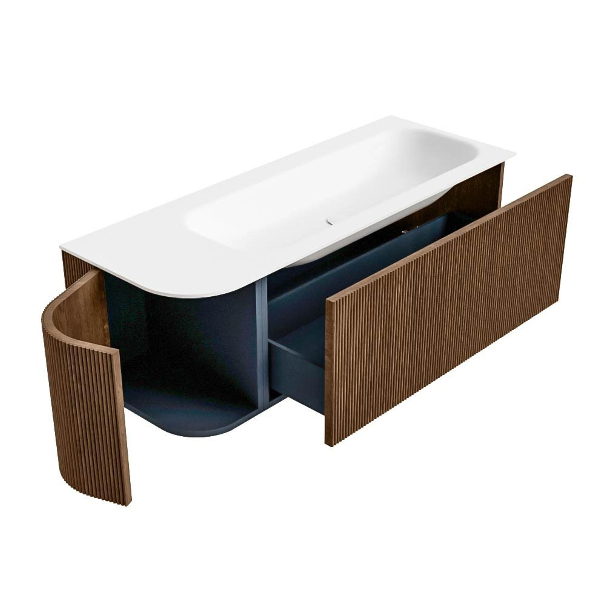 Het ultieme badmeubel dat je badkamer transformeert tot een oase van verfijning. Met zijn halfronde, verticale stroken van massief eiken, verkrijgbaar in de kleuren Oak en Walnut, straalt KURVE vakmanschap uit in elk detail. De zachte rondingen en slim ontworpen deurtjes, elk 40cm hoog, nodigen uit tot gebruik, terwijl de ruimte binnenin optimaal benut wordt dankzij de royale lade van dezelfde hoogte.