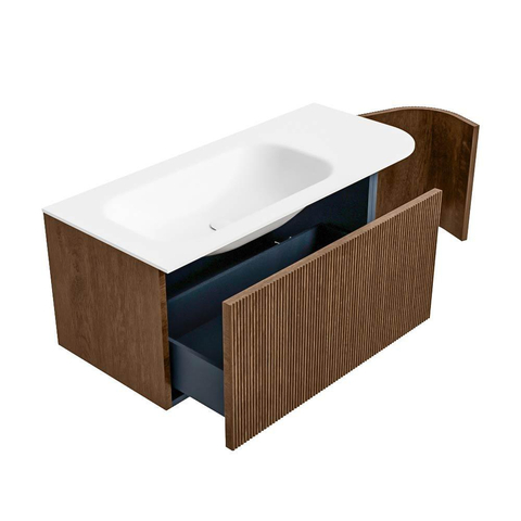 Het ultieme badmeubel dat je badkamer transformeert tot een oase van verfijning. Met zijn halfronde, verticale stroken van massief eiken, verkrijgbaar in de kleuren Oak en Walnut, straalt KURVE vakmanschap uit in elk detail. De zachte rondingen en slim ontworpen deurtjes, elk 40cm hoog, nodigen uit tot gebruik, terwijl de ruimte binnenin optimaal benut wordt dankzij de royale lade van dezelfde hoogte.