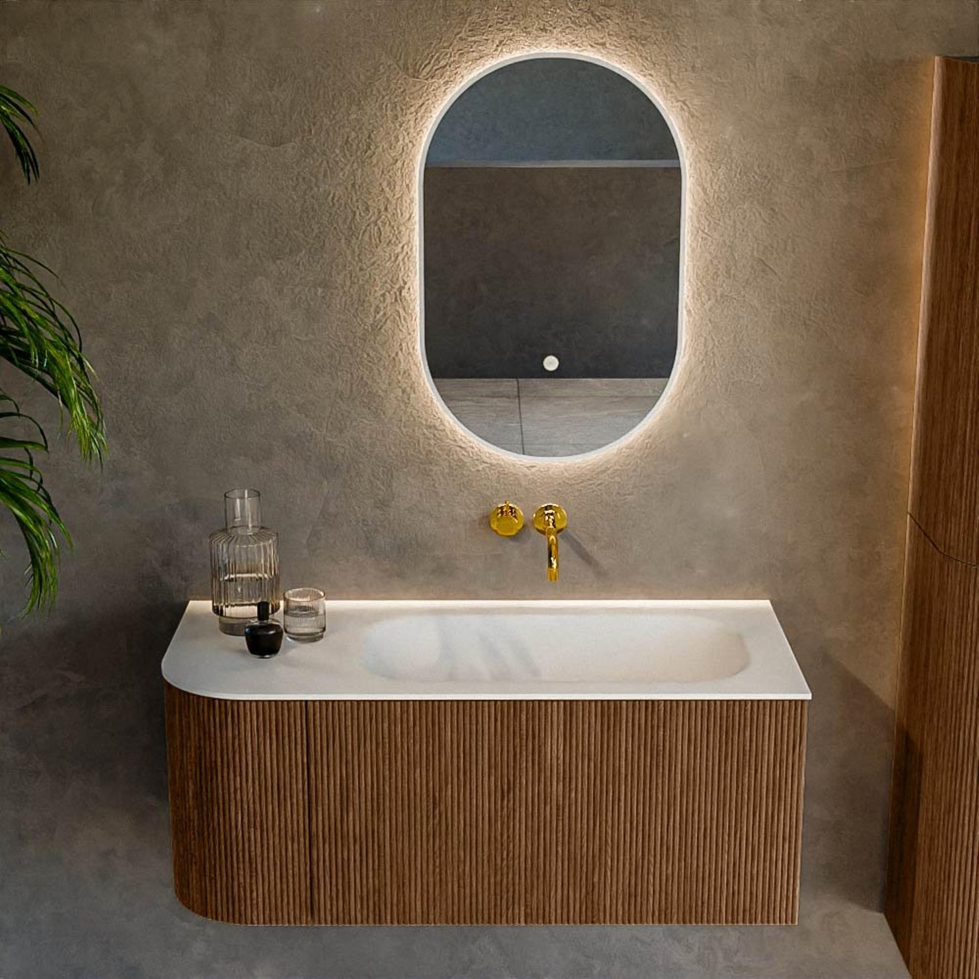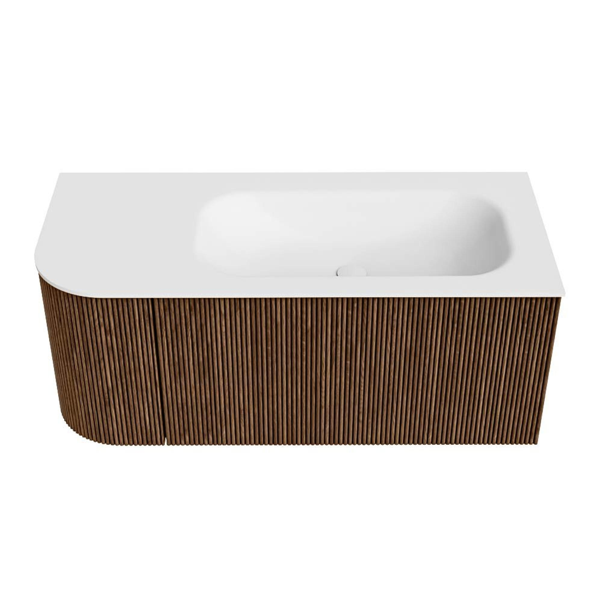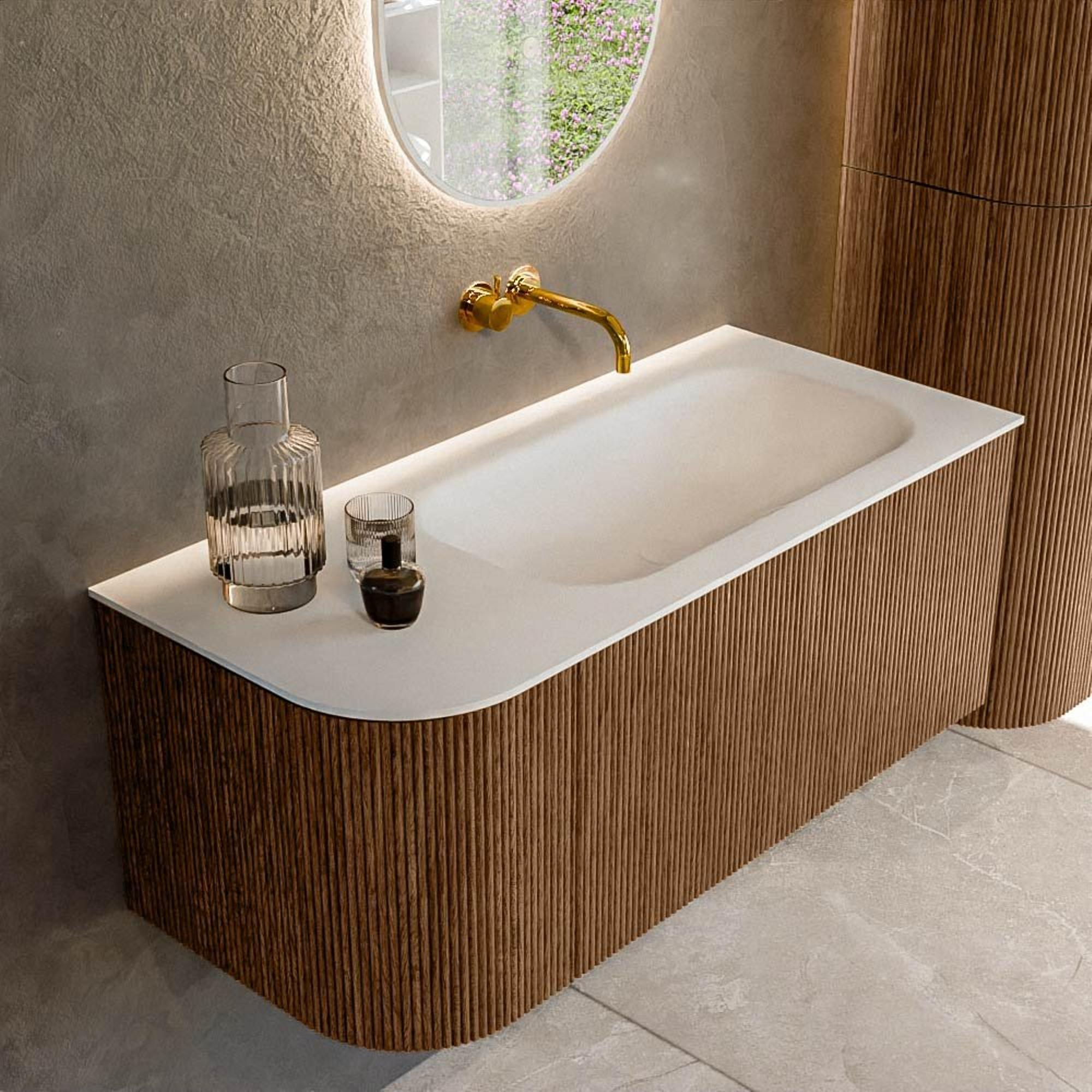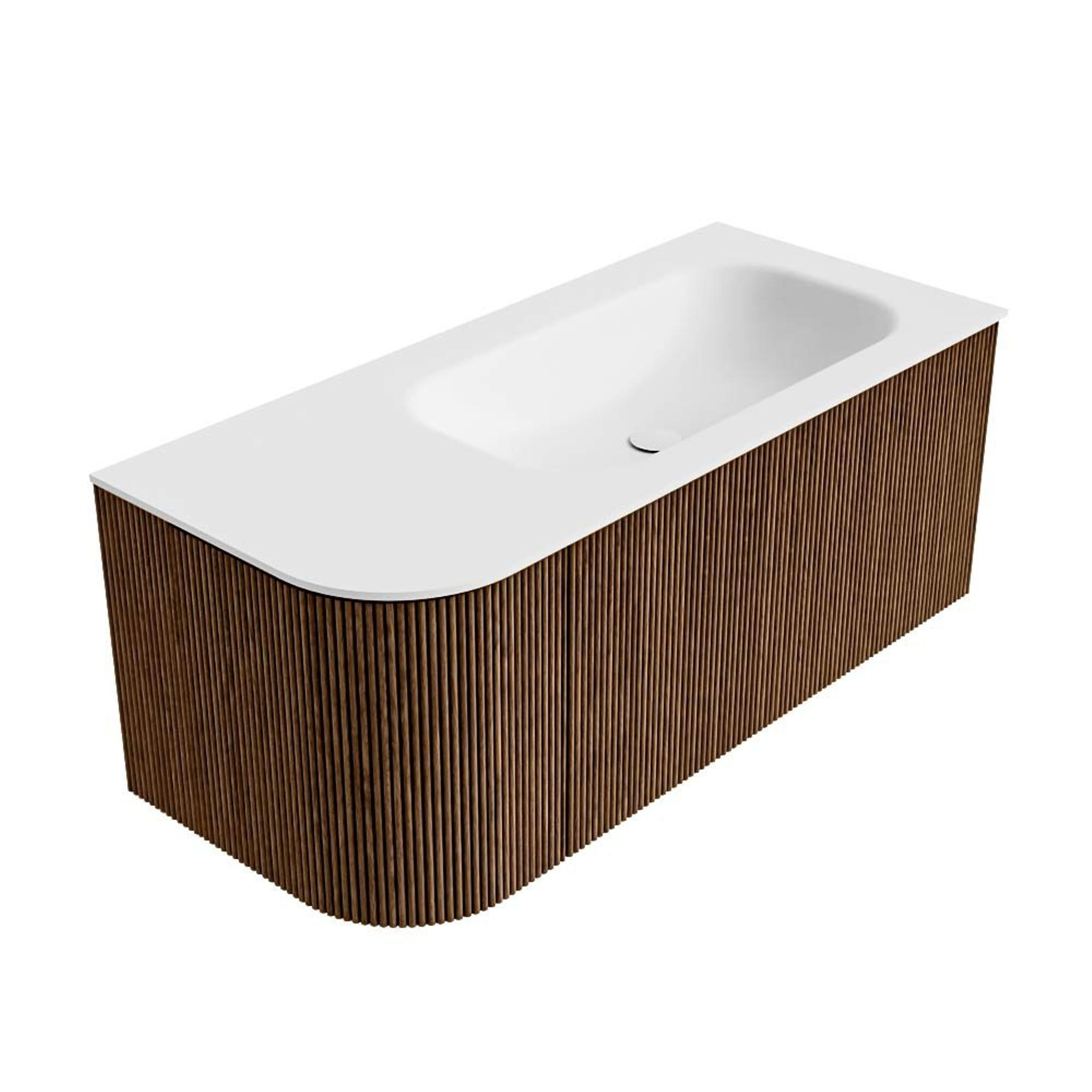 Het ultieme badmeubel dat je badkamer transformeert tot een oase van verfijning. Met zijn halfronde, verticale stroken van massief eiken, verkrijgbaar in de kleuren Oak en Walnut, straalt KURVE vakmanschap uit in elk detail. De zachte rondingen en slim ontworpen deurtjes, elk 40cm hoog, nodigen uit tot gebruik, terwijl de ruimte binnenin optimaal benut wordt dankzij de royale lade van dezelfde hoogte.