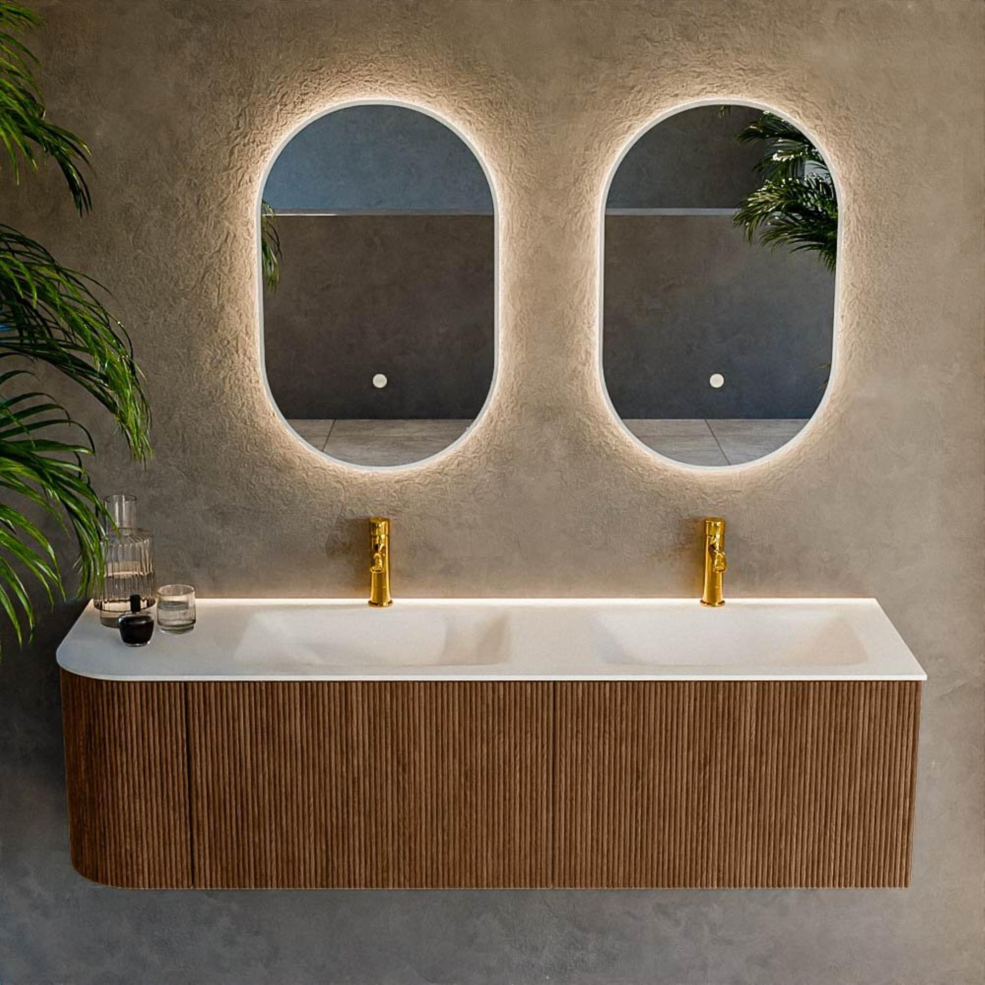 Het ultieme badmeubel dat je badkamer transformeert tot een oase van verfijning. Met zijn halfronde, verticale stroken van massief eiken, verkrijgbaar in de kleuren Oak en Walnut, straalt KURVE vakmanschap uit in elk detail. De zachte rondingen en slim ontworpen deurtjes, elk 40cm hoog, nodigen uit tot gebruik, terwijl de ruimte binnenin optimaal benut wordt dankzij de royale lade van dezelfde hoogte.