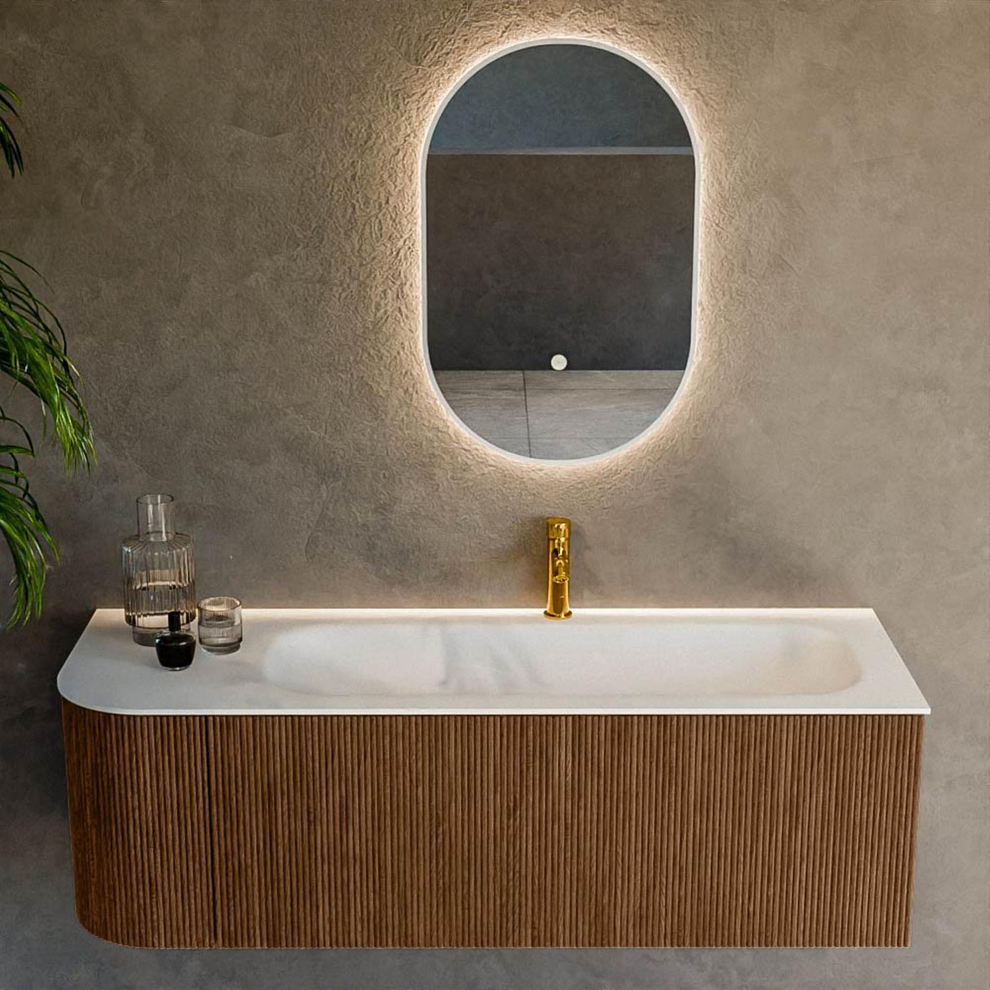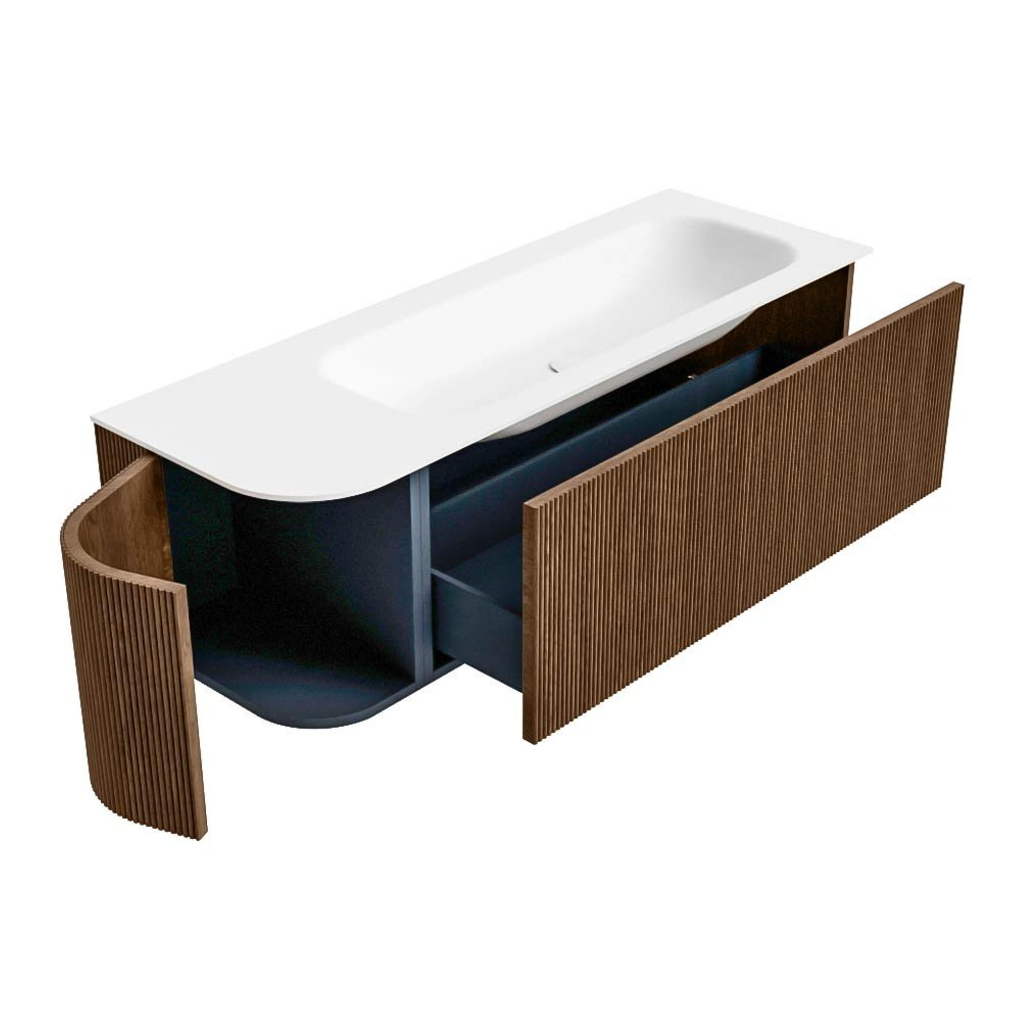 Het ultieme badmeubel dat je badkamer transformeert tot een oase van verfijning. Met zijn halfronde, verticale stroken van massief eiken, verkrijgbaar in de kleuren Oak en Walnut, straalt KURVE vakmanschap uit in elk detail. De zachte rondingen en slim ontworpen deurtjes, elk 40cm hoog, nodigen uit tot gebruik, terwijl de ruimte binnenin optimaal benut wordt dankzij de royale lade van dezelfde hoogte.