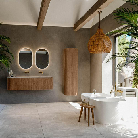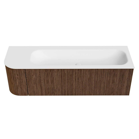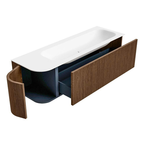 Het ultieme badmeubel dat je badkamer transformeert tot een oase van verfijning. Met zijn halfronde, verticale stroken van massief eiken, verkrijgbaar in de kleuren Oak en Walnut, straalt KURVE vakmanschap uit in elk detail. De zachte rondingen en slim ontworpen deurtjes, elk 40cm hoog, nodigen uit tot gebruik, terwijl de ruimte binnenin optimaal benut wordt dankzij de royale lade van dezelfde hoogte.
