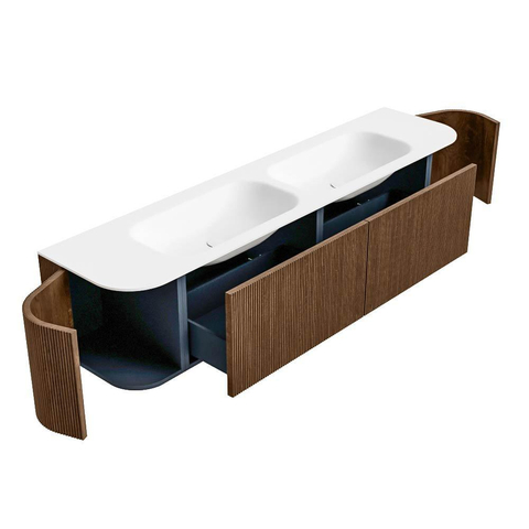 Het ultieme badmeubel dat je badkamer transformeert tot een oase van verfijning. Met zijn halfronde, verticale stroken van massief eiken, verkrijgbaar in de kleuren Oak en Walnut, straalt KURVE vakmanschap uit in elk detail. De zachte rondingen en slim ontworpen deurtjes, elk 40cm hoog, nodigen uit tot gebruik, terwijl de ruimte binnenin optimaal benut wordt dankzij de royale lade van dezelfde hoogte.