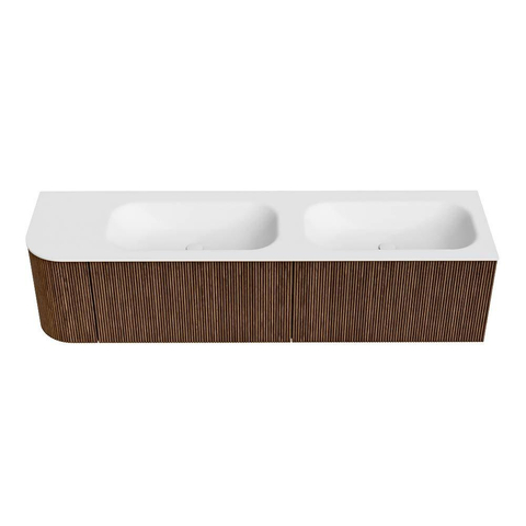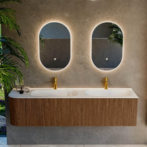 Het ultieme badmeubel dat je badkamer transformeert tot een oase van verfijning. Met zijn halfronde, verticale stroken van massief eiken, verkrijgbaar in de kleuren Oak en Walnut, straalt KURVE vakmanschap uit in elk detail. De zachte rondingen en slim ontworpen deurtjes, elk 40cm hoog, nodigen uit tot gebruik, terwijl de ruimte binnenin optimaal benut wordt dankzij de royale lade van dezelfde hoogte.