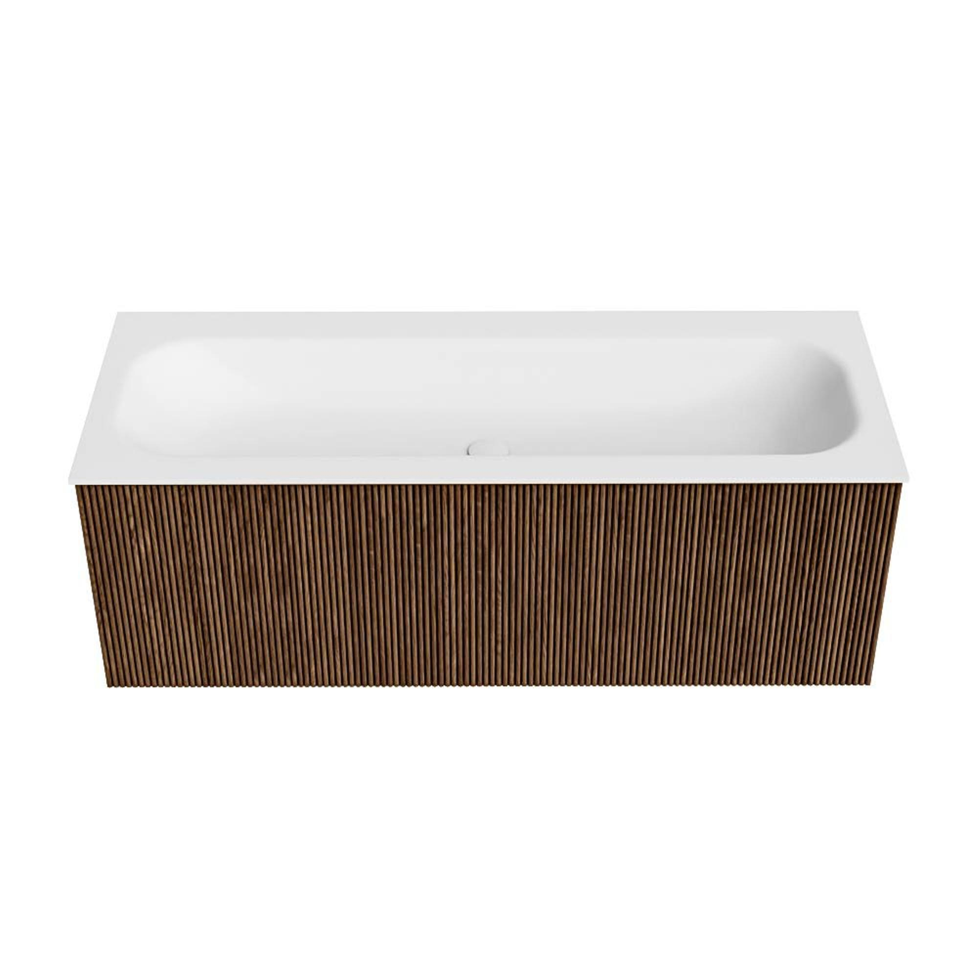 MONDIAZ KURVE 120cm badmeubel kleur Walnut met 1 lade. Wastafel BIG LARGE midden 2 kraangaten Talc.