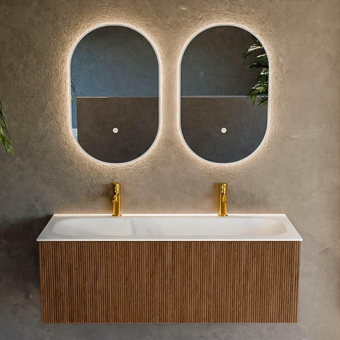 Het ultieme badmeubel dat je badkamer transformeert tot een oase van verfijning. Met zijn halfronde, verticale stroken van massief eiken, verkrijgbaar in de kleuren Oak en Walnut, straalt KURVE vakmanschap uit in elk detail. De zachte rondingen en slim ontworpen deurtjes, elk 40cm hoog, nodigen uit tot gebruik, terwijl de ruimte binnenin optimaal benut wordt dankzij de royale lade van dezelfde hoogte.