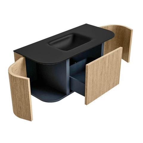 Het ultieme badmeubel dat je badkamer transformeert tot een oase van verfijning. Met zijn halfronde, verticale stroken van massief eiken, verkrijgbaar in de kleuren Oak en Walnut, straalt KURVE vakmanschap uit in elk detail. De zachte rondingen en slim ontworpen deurtjes, elk 40cm hoog, nodigen uit tot gebruik, terwijl de ruimte binnenin optimaal benut wordt dankzij de royale lade van dezelfde hoogte.