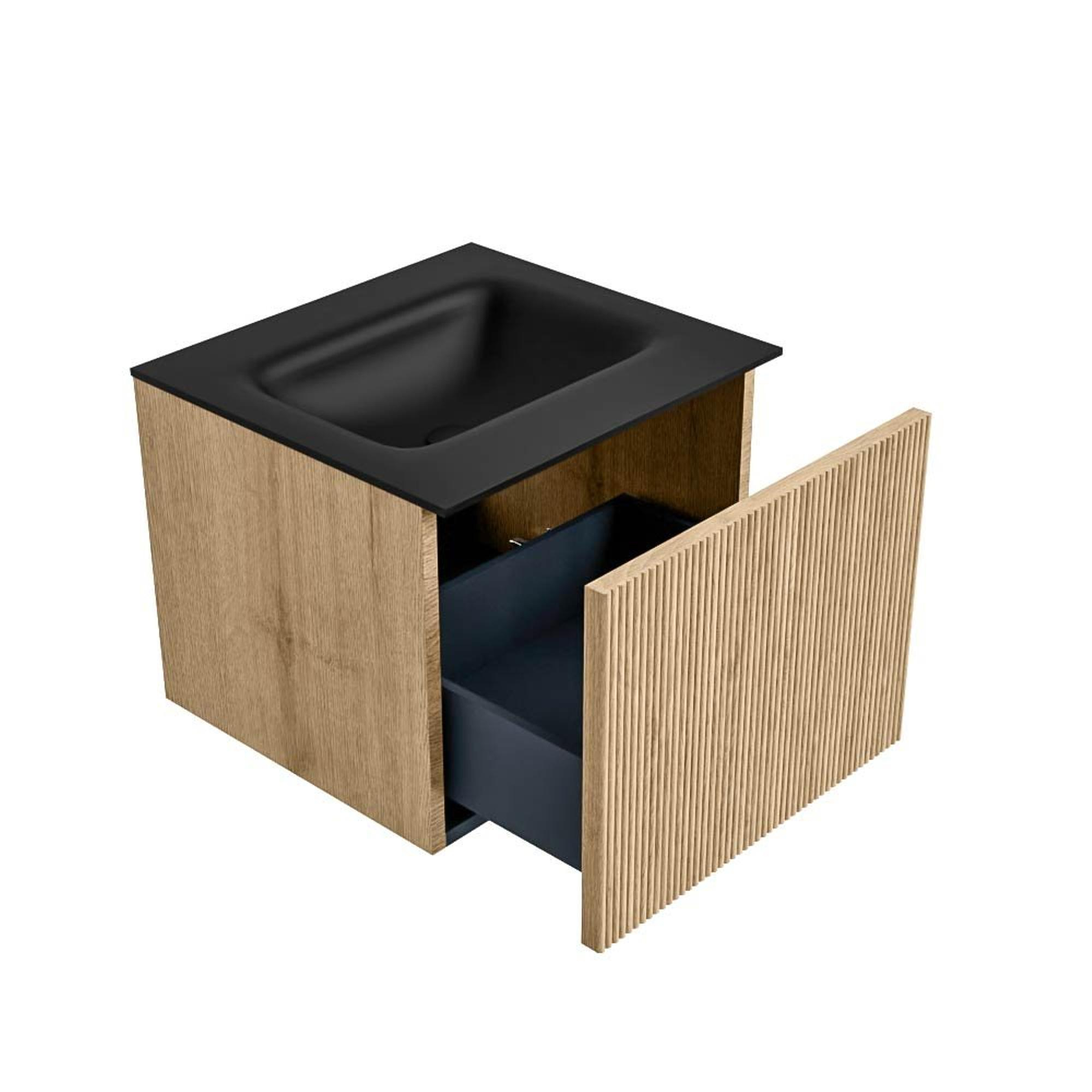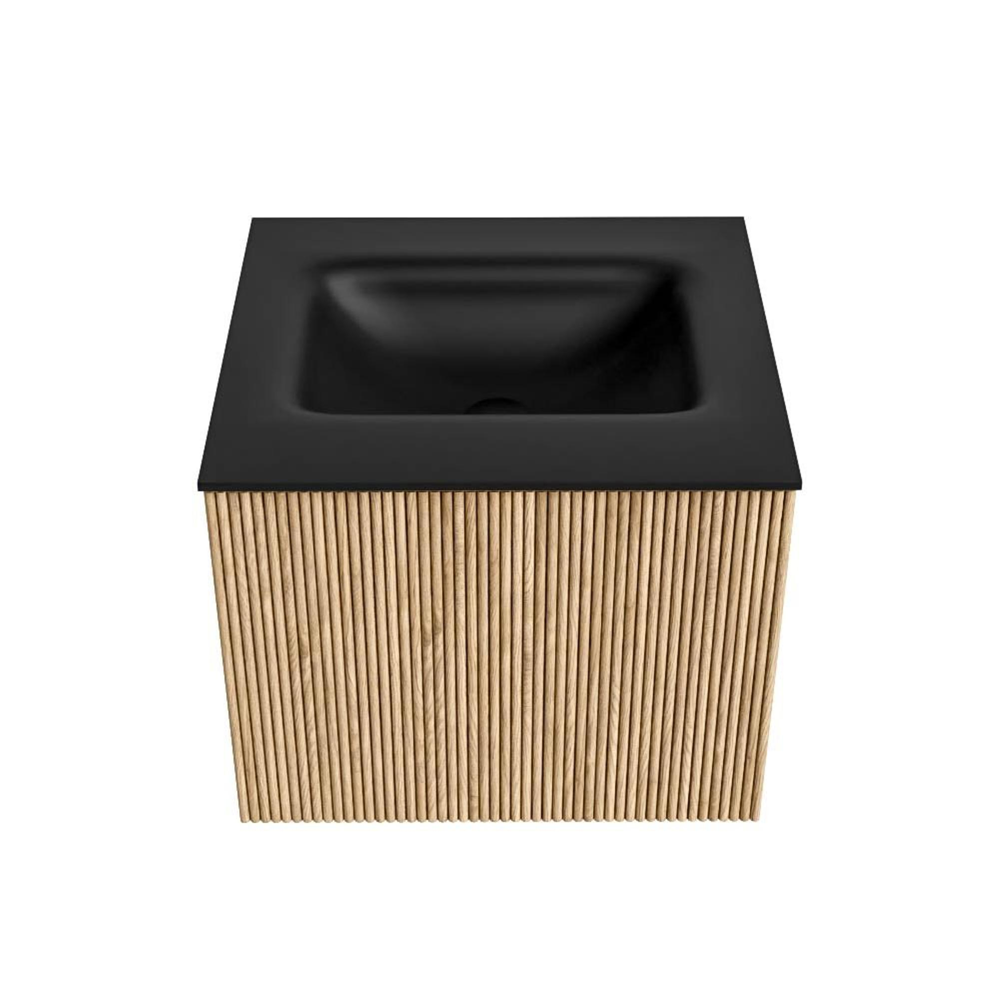 MONDIAZ KURVE 50cm badmeubel kleur Oak met 1 lade. Wastafel GRUNNE midden zonder kraangat Urban.