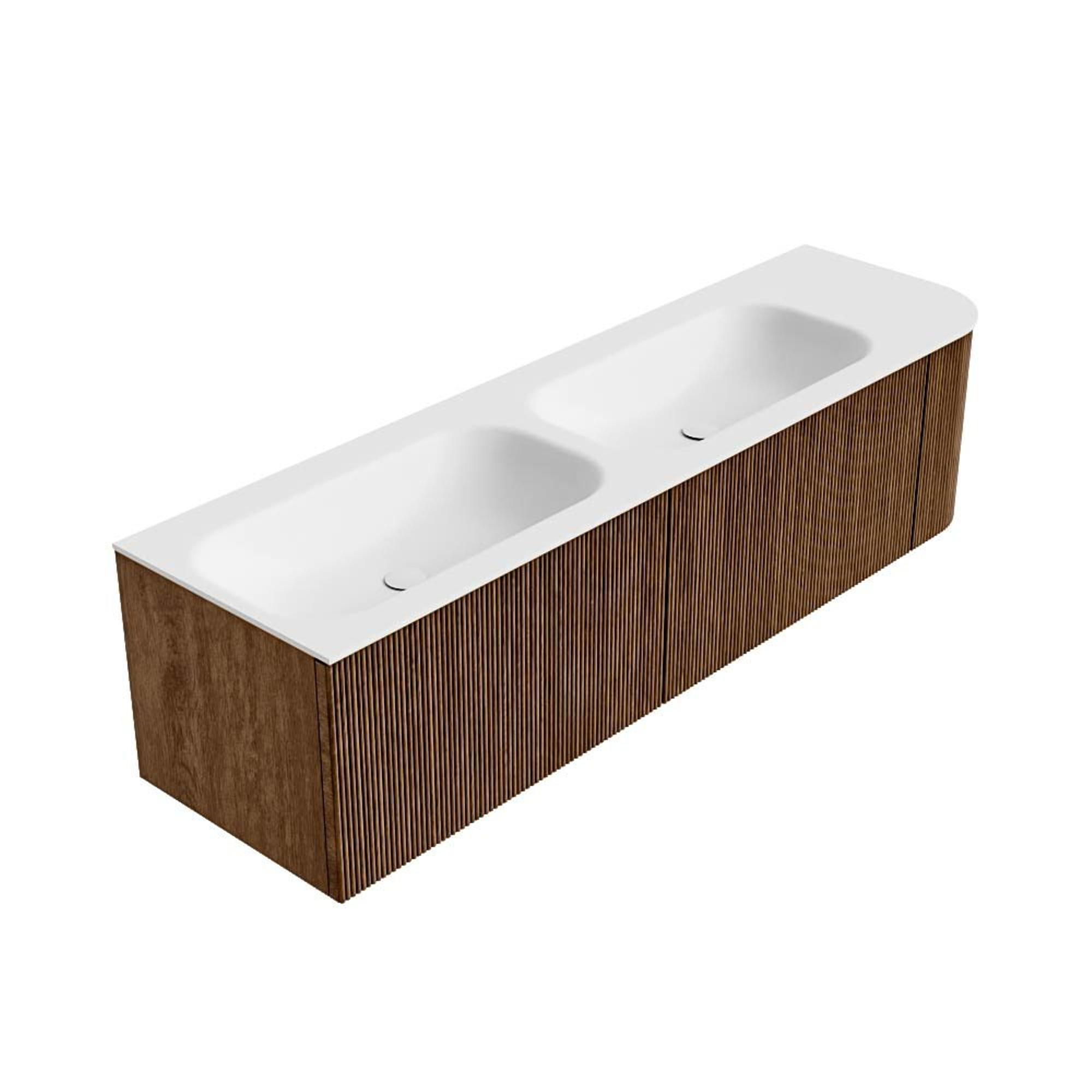 MONDIAZ KURVE 165cm badmeubel met module 25 R kleur Walnut met 2 lades en 1 deur. Wastafel BIG SMALL dubbel / links 2 kraangaten Talc.
