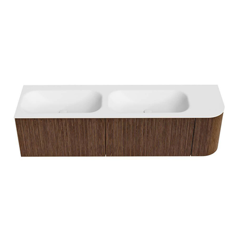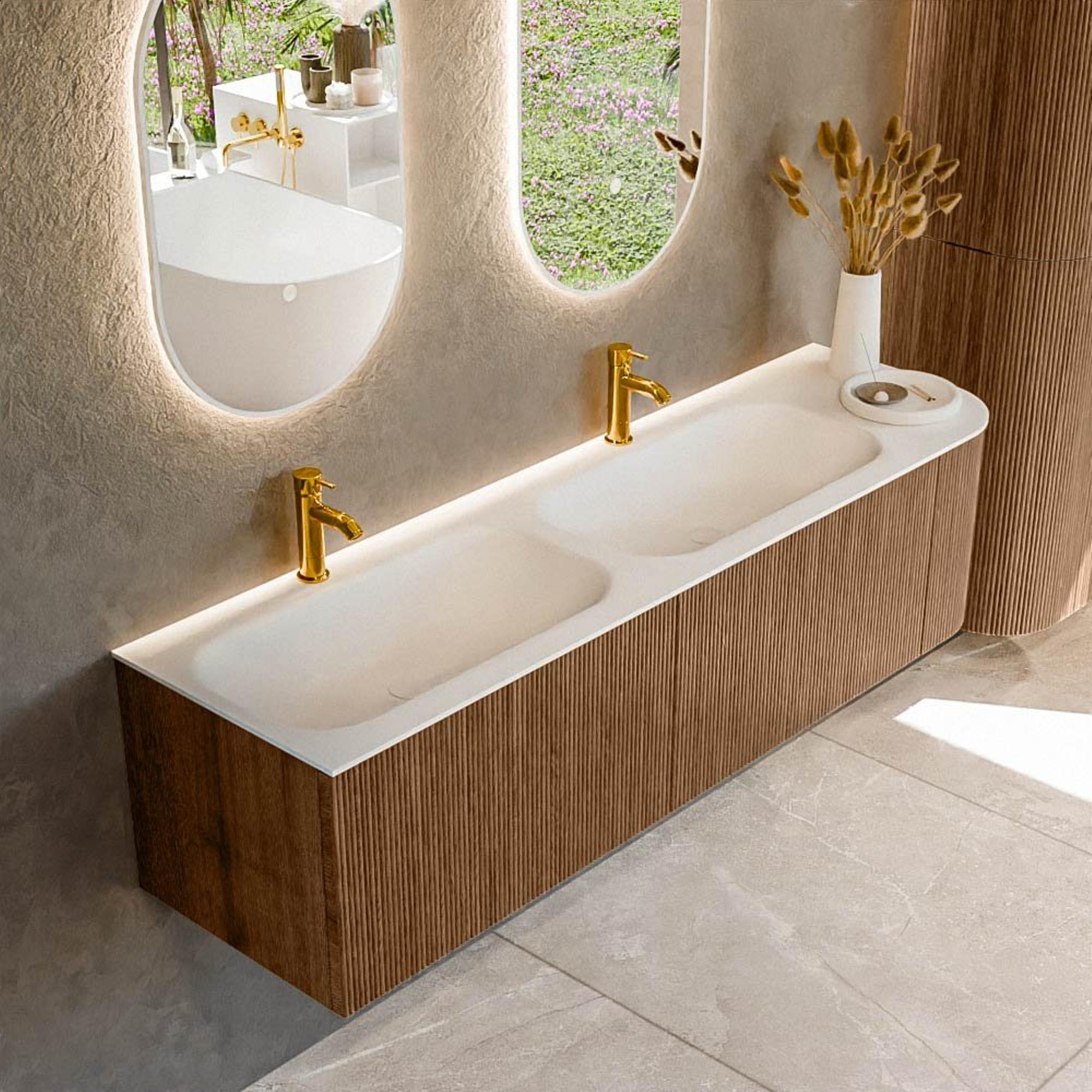 Het ultieme badmeubel dat je badkamer transformeert tot een oase van verfijning. Met zijn halfronde, verticale stroken van massief eiken, verkrijgbaar in de kleuren Oak en Walnut, straalt KURVE vakmanschap uit in elk detail. De zachte rondingen en slim ontworpen deurtjes, elk 40cm hoog, nodigen uit tot gebruik, terwijl de ruimte binnenin optimaal benut wordt dankzij de royale lade van dezelfde hoogte.