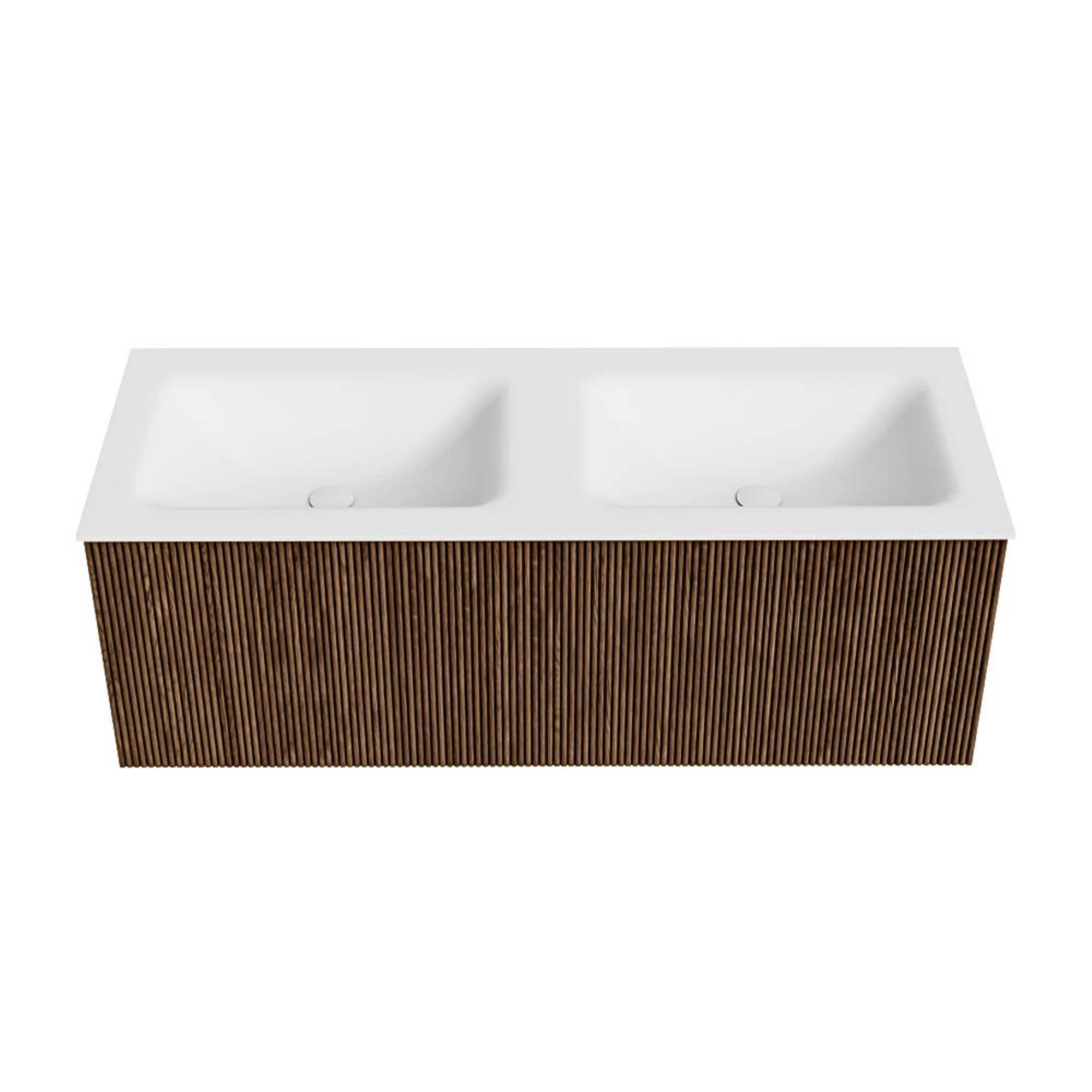 MONDIAZ KURVE 120cm badmeubel kleur Walnut met 1 lade. Wastafel CLOUD dubbel 2 kraangaten Talc.